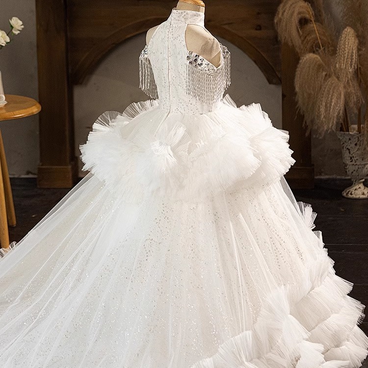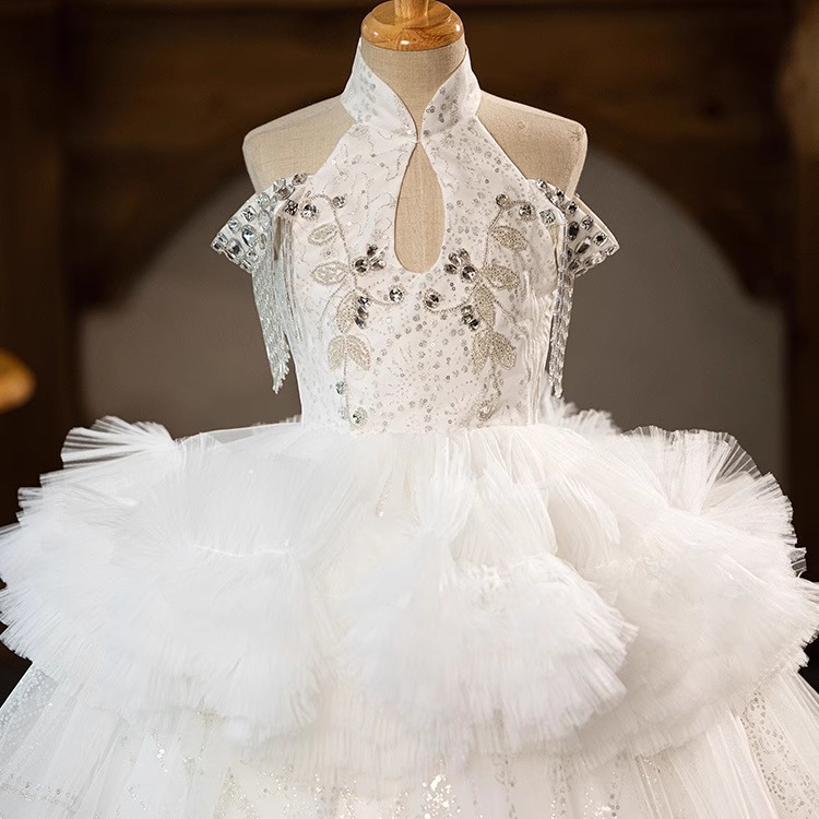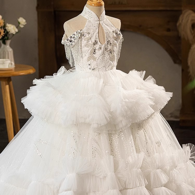 中式女童生日礼服白色拖尾蓬蓬公主裙走秀儿童演出服高端轻奢小众
