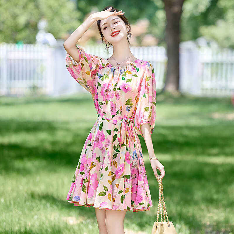 雪纺碎花连衣裙女夏季2025新款高级感小个子气质减龄遮肚显瘦裙子