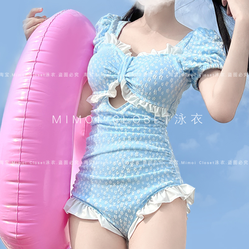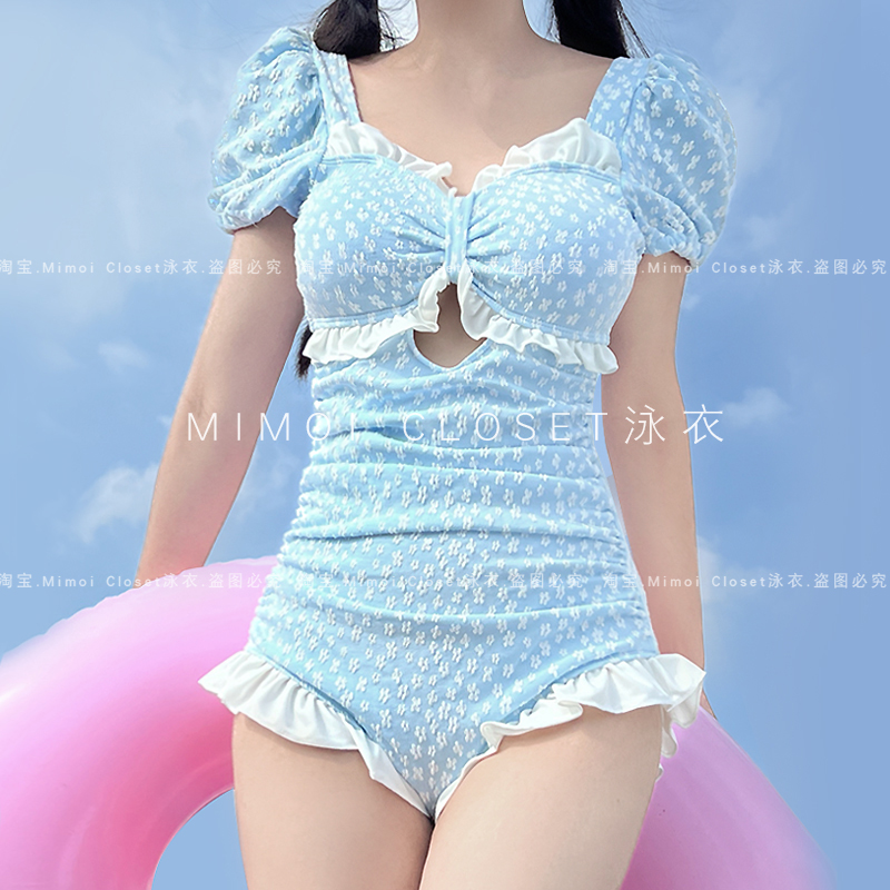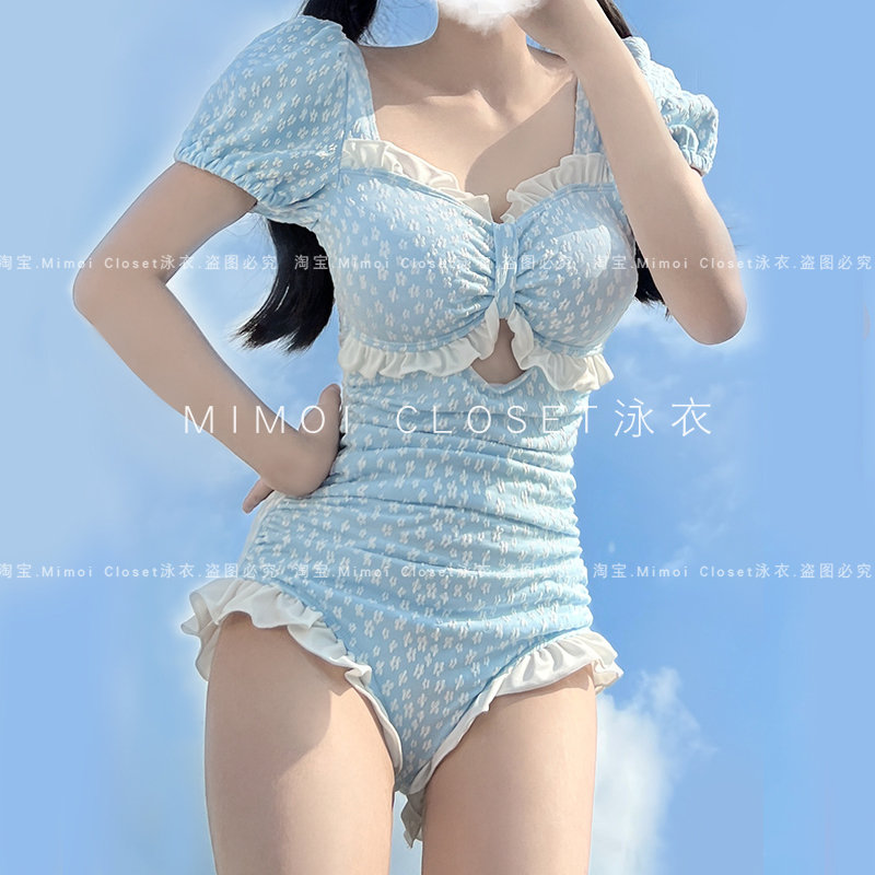 Mimoi Closet新款短袖小雏菊碎花可爱遮肚微胖泳装连体游泳衣女款