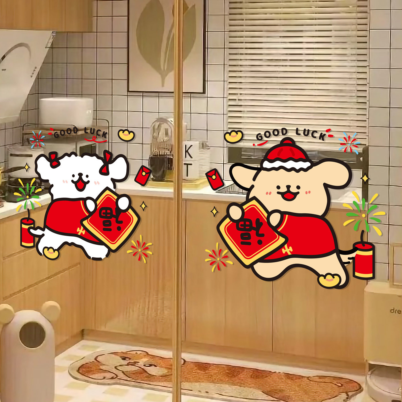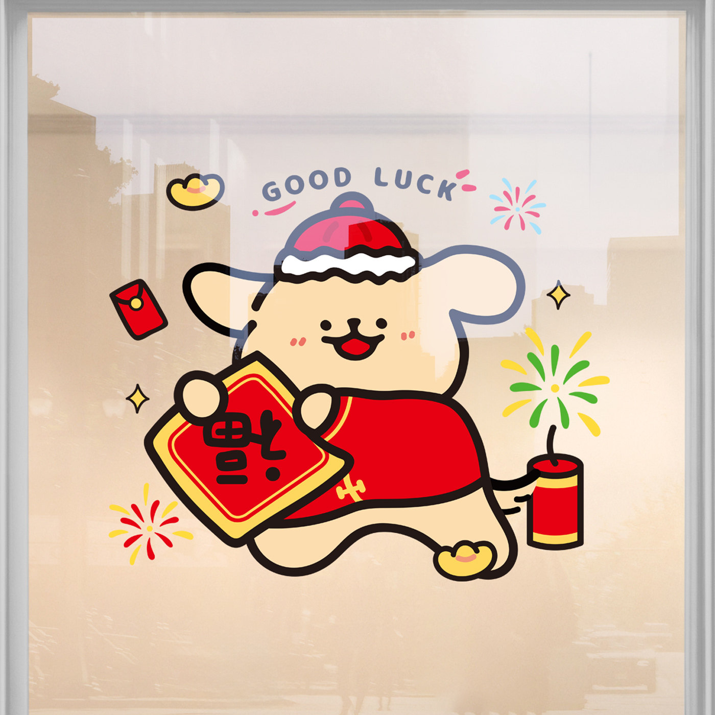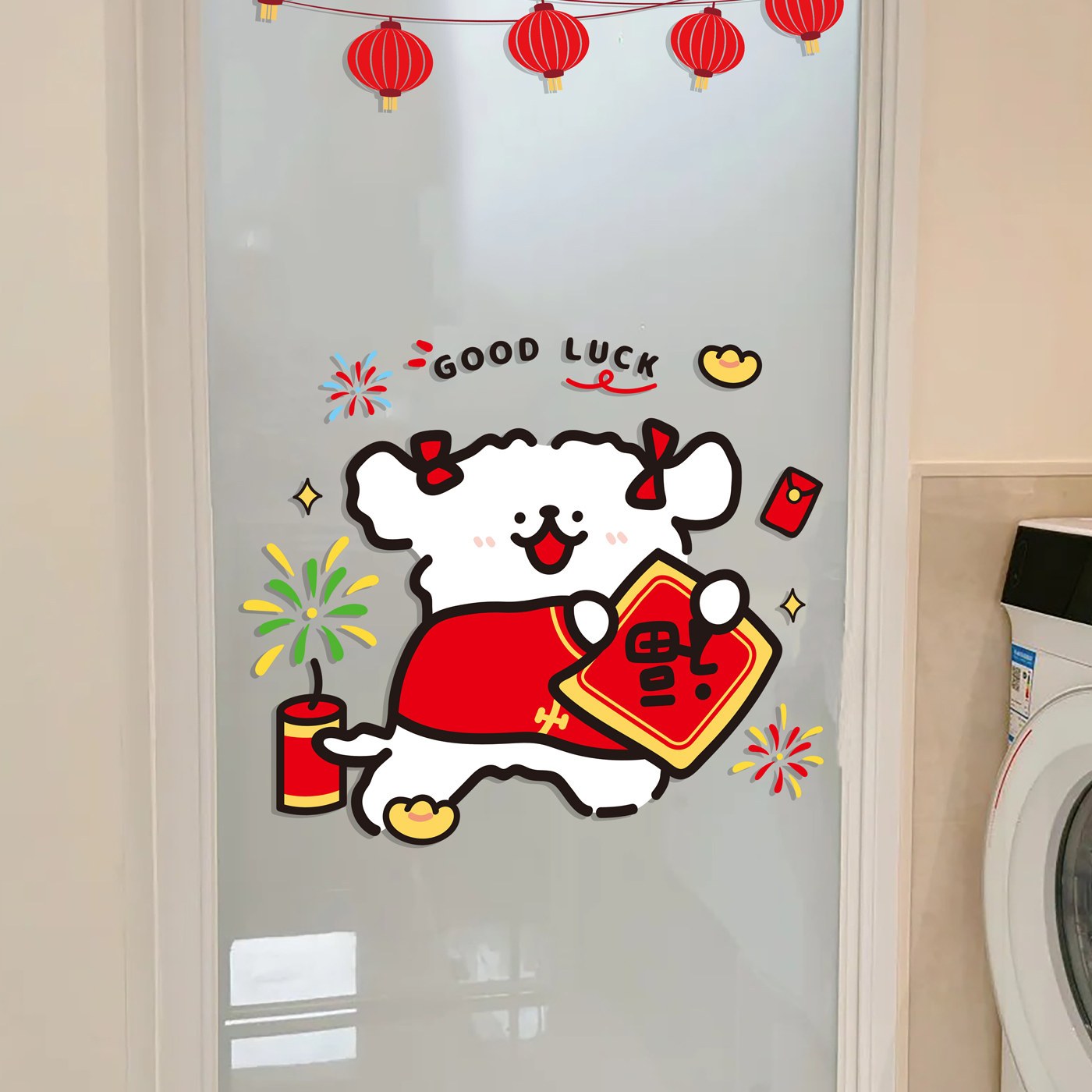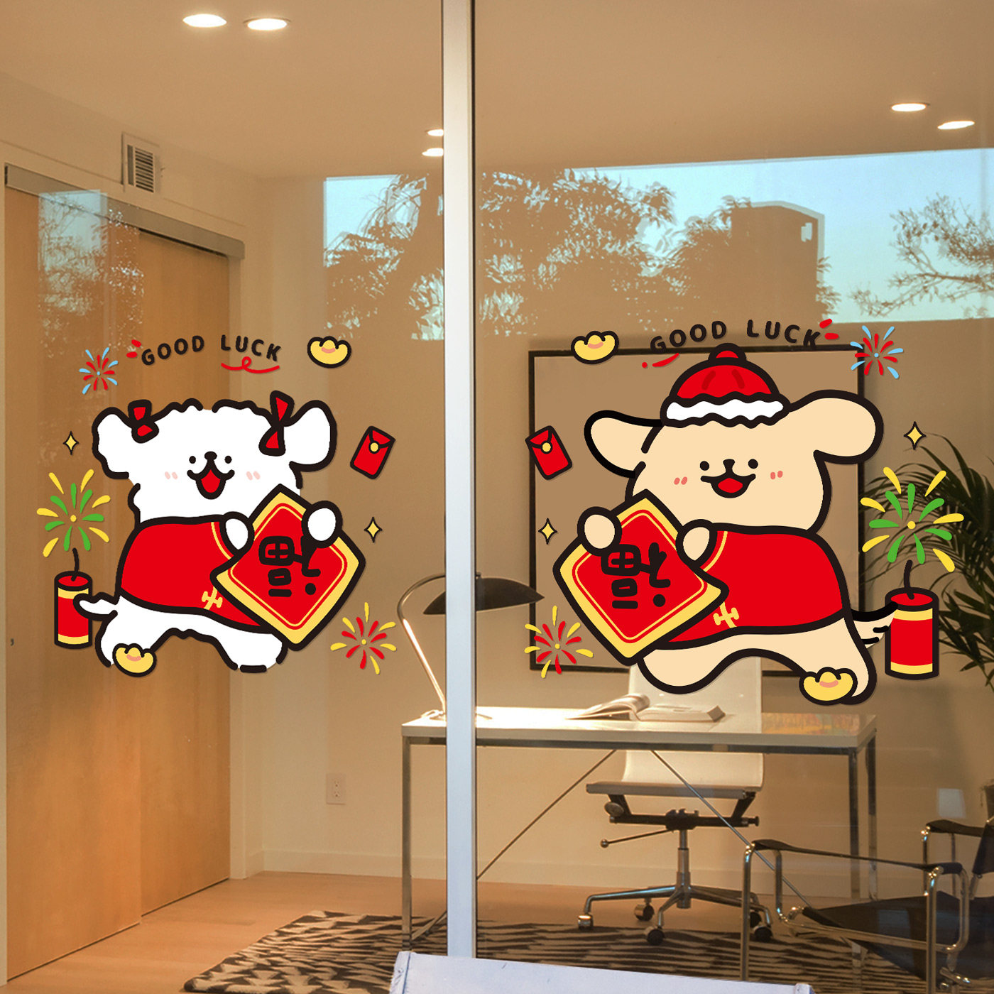 线条小狗新年福字装饰玻璃贴纸