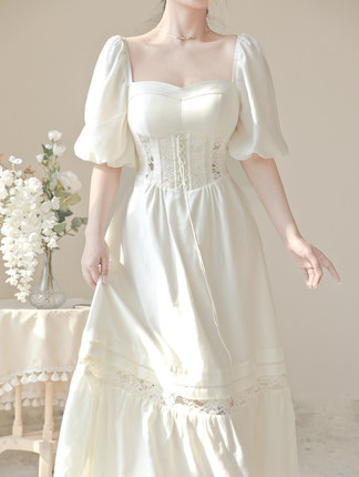 法式复古裙蕾丝镂空鱼骨连衣裙女