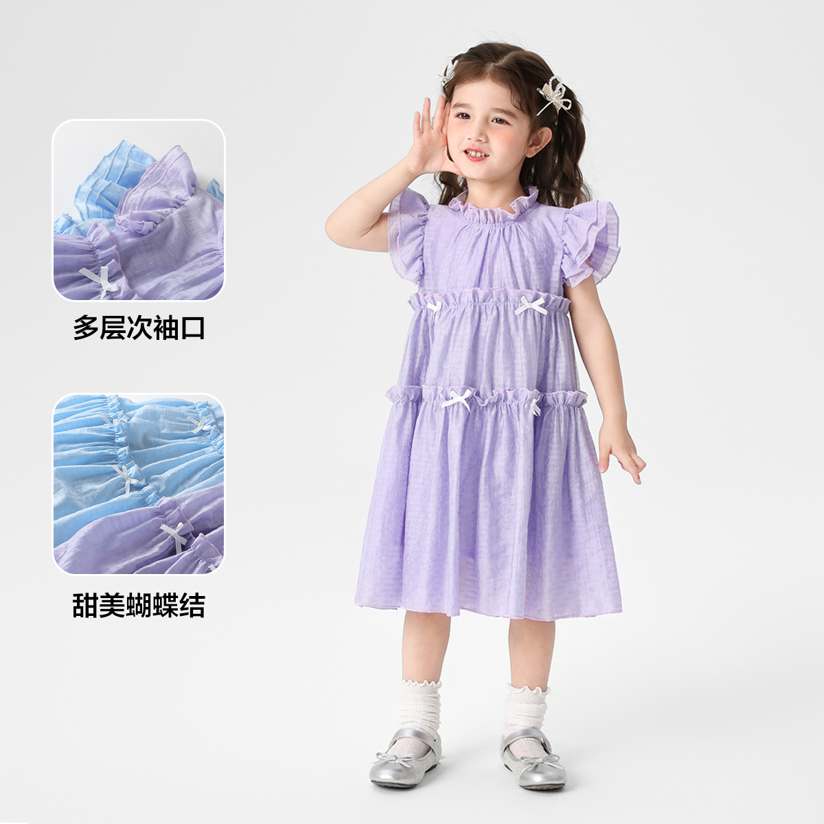 右欧女童公主裙连衣裙蝴蝶结儿童裙子荷叶袖纯色夏季纱裙新款童装