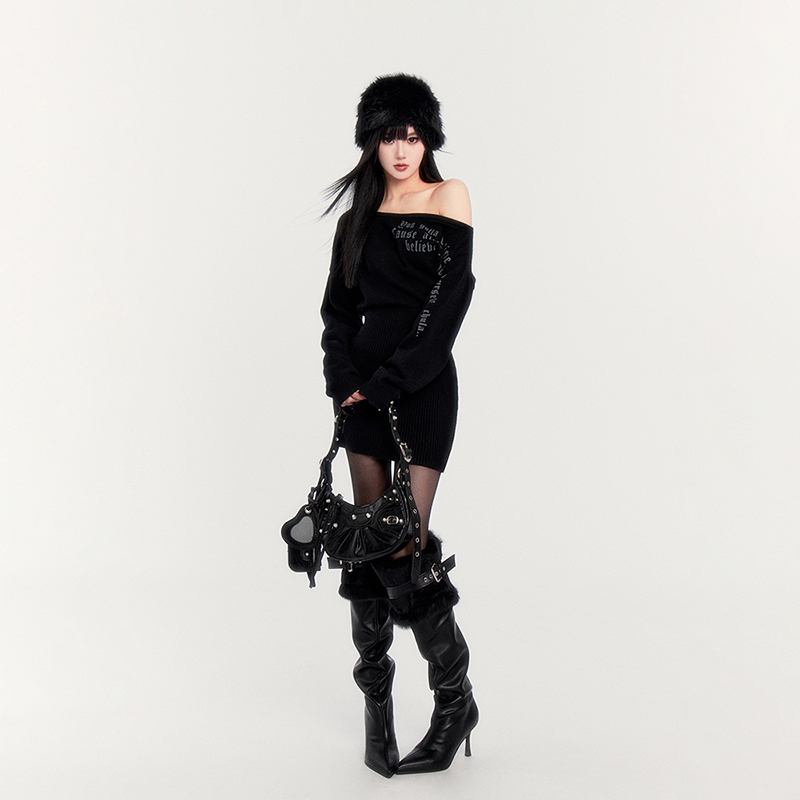 VOCK 辣妹审判 暗黑露肩印花收腰显瘦斜肩包臀毛衣针织连衣裙秋冬