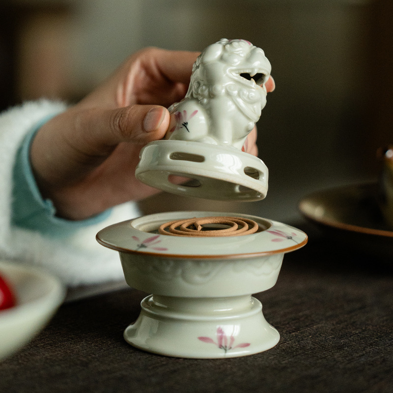纯手绘粉兰花陶瓷狻猊瑞兽香炉熏香炉沉香檀香香灰香道茶道