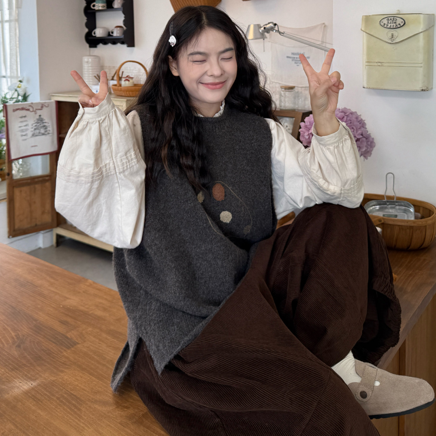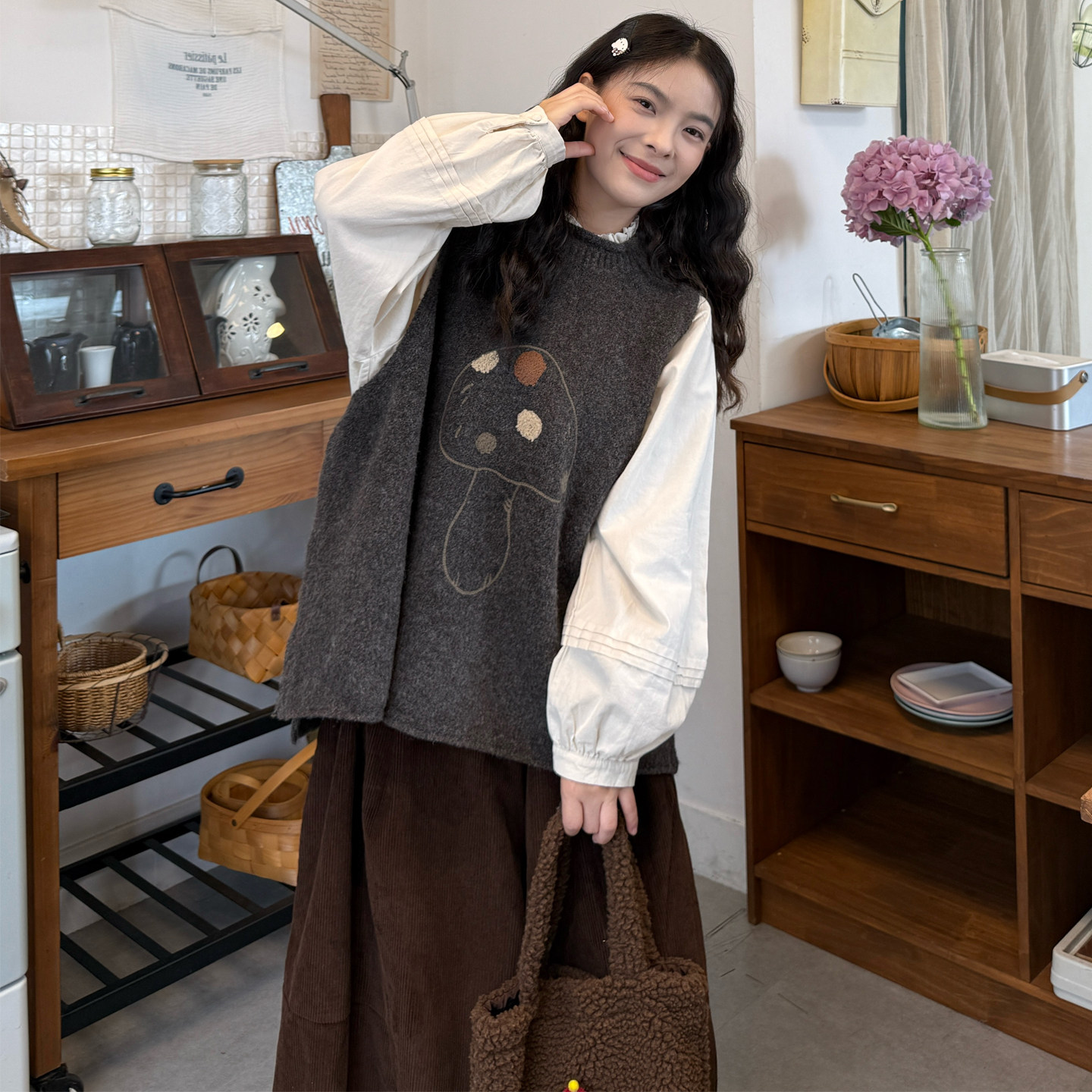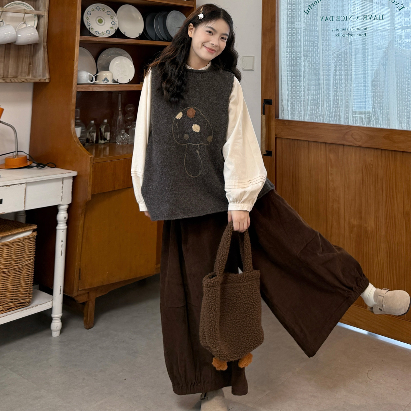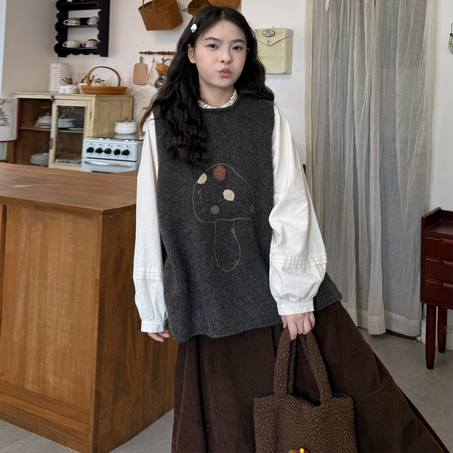 衬衫+蘑菇针织马甲+灯芯绒裤子