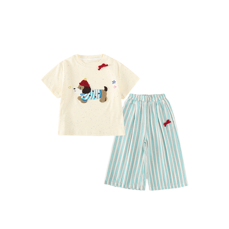 拉夏贝尔女童夏套装2025新款潮酷穿搭韩系卡通条纹女宝洋气两件套