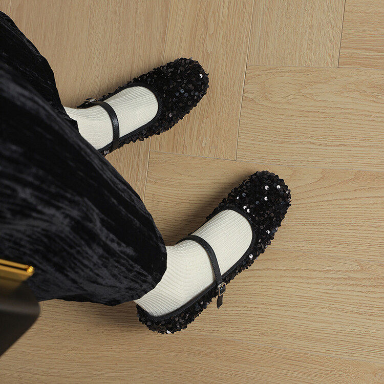 新款~法式玛丽珍鞋女粗跟银色晚晚风温柔小皮鞋中跟时尚亮片单鞋