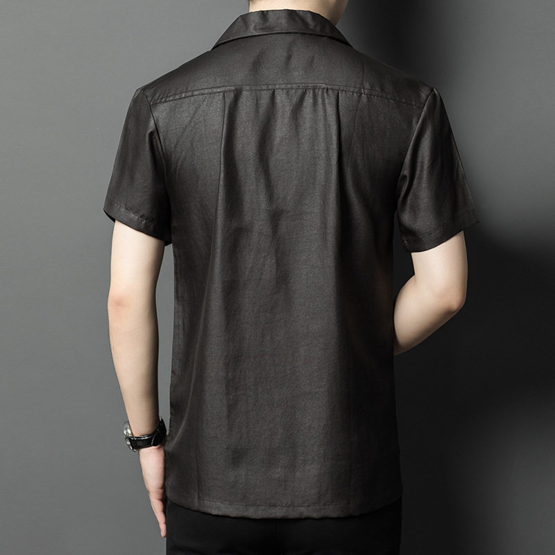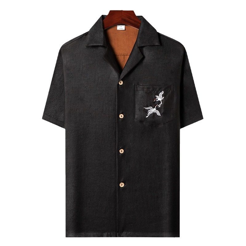 真丝香云纱衬衫100%桑蚕丝短袖中老年古巴领衬衣口袋刺绣款中国风