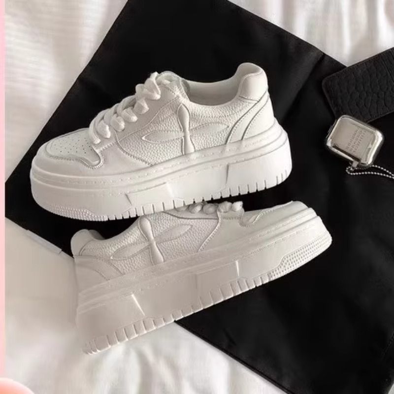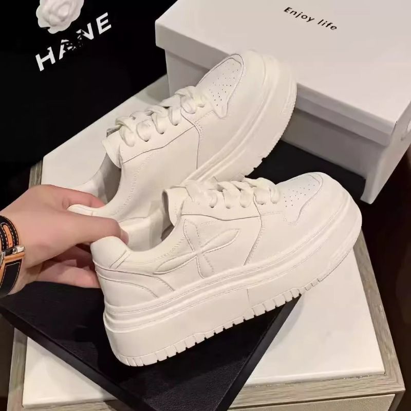 白色运动鞋女夏季松糕厚底小白鞋圆头系带面包板鞋增高休闲鞋子女