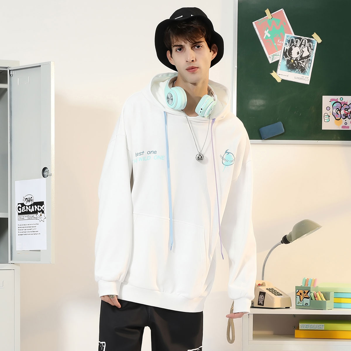 GENANX闪电潮牌连帽情侣蓝色卫衣男女春秋季新款百搭国潮白色上衣
