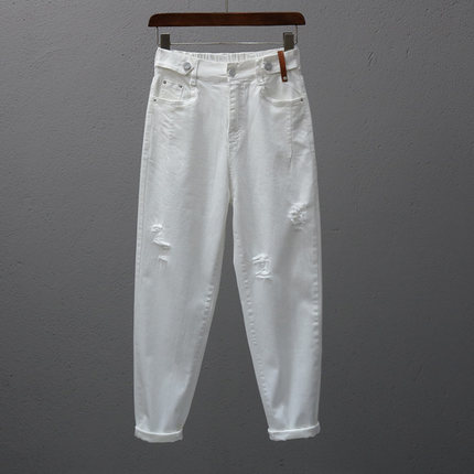 春夏破洞宽松牛仔裤女白色2025松紧腰弹力显瘦9分哈伦裤潮萝卜裤