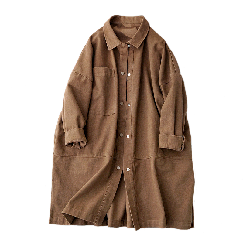 特日系斜纹棉布塌肩长袖风衣女装秋季新品薄外套宽松休闲中长上衣