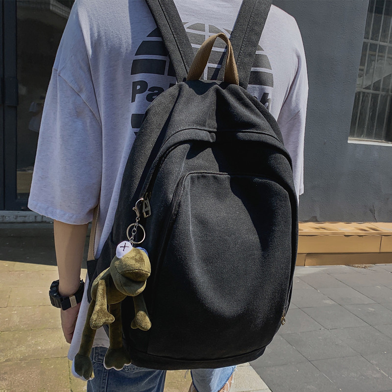 ins复古帆布纯色大容量双肩包女百搭书包学生初中生背包男大学生