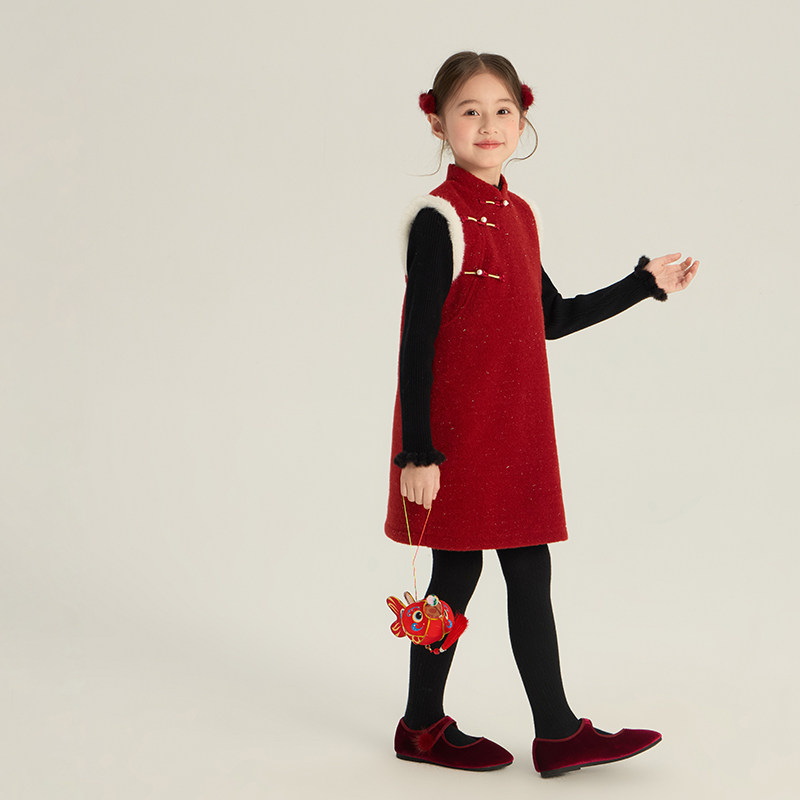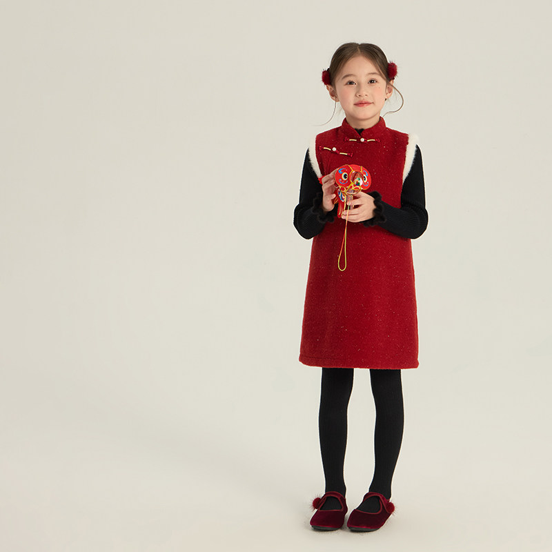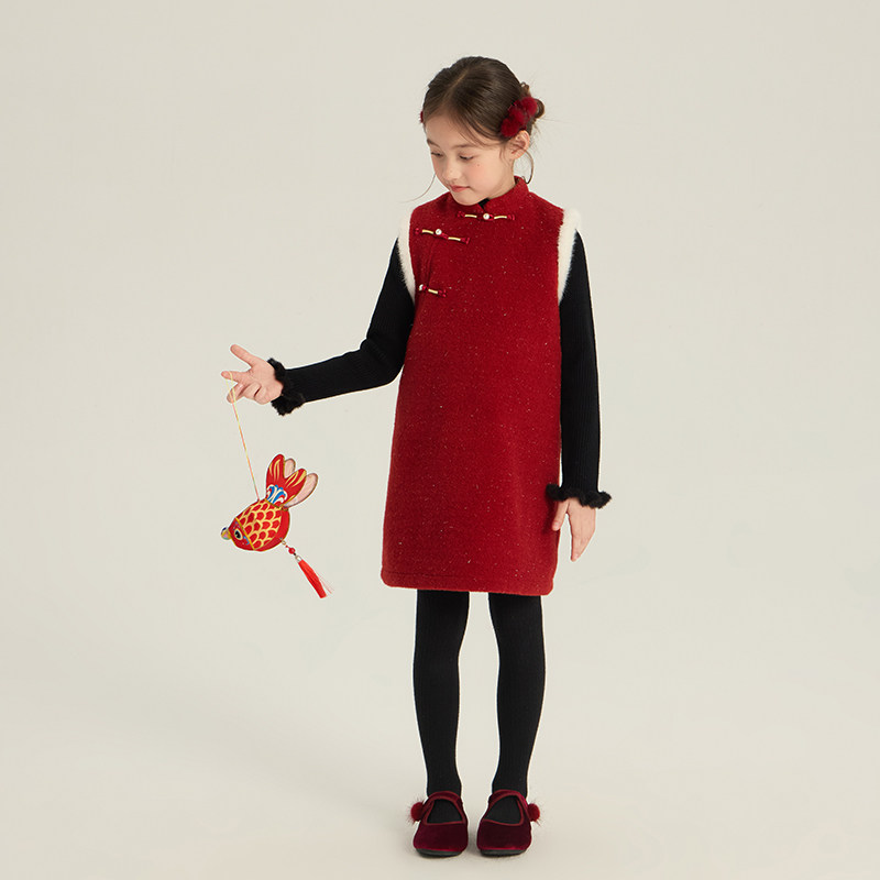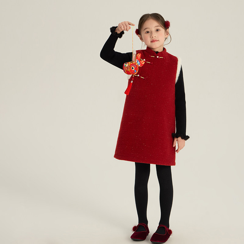 Yumi妈女童冬季红色盘扣旗袍裙新中式拜年服国风保暖背心裙25M191