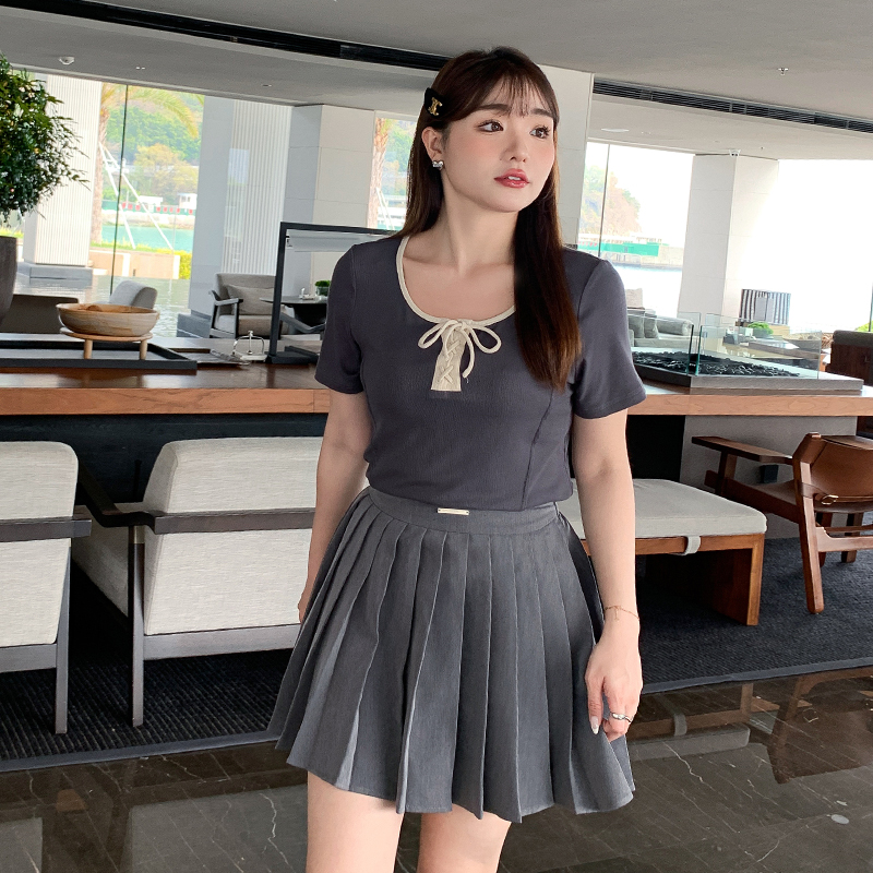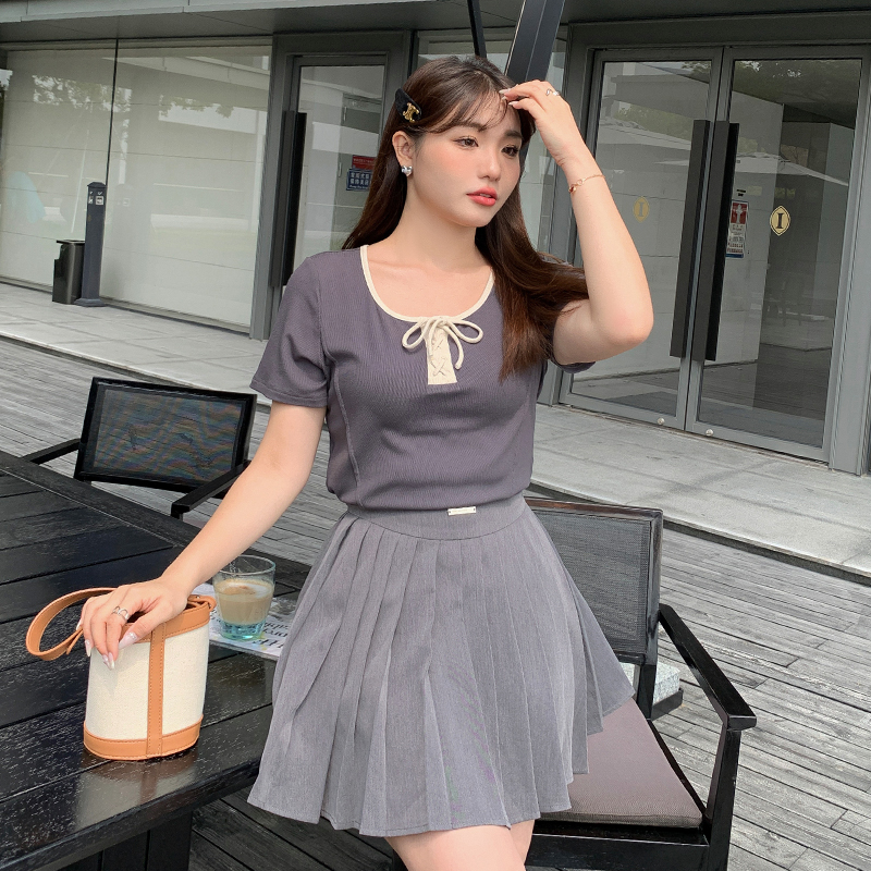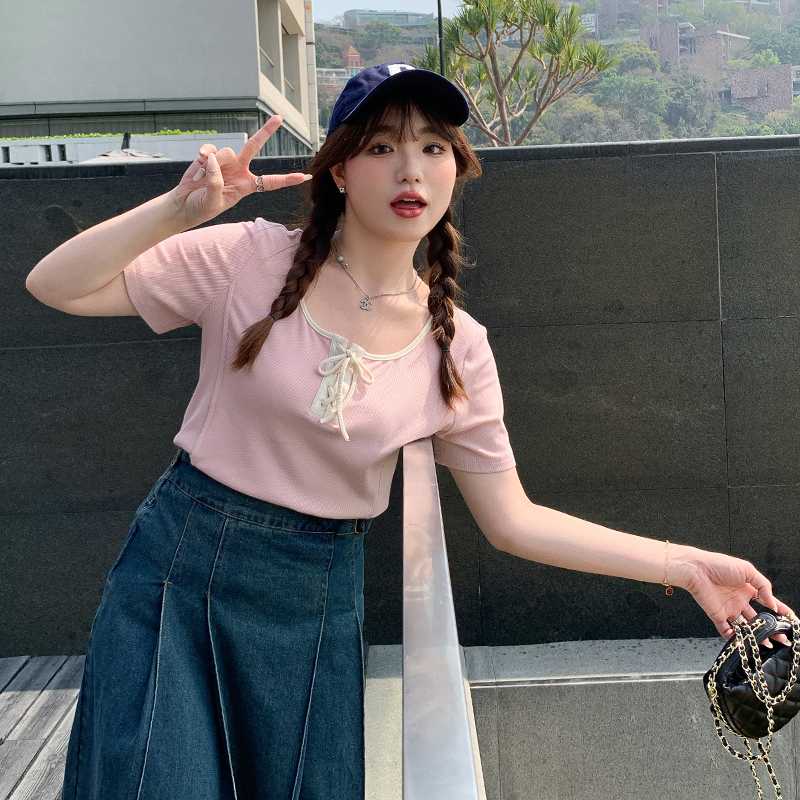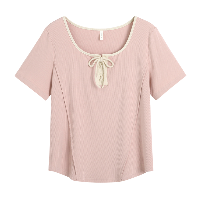 小波家2025夏季新品胖mm韩系甜美温柔风上衣纯欲绑带短袖百搭T恤