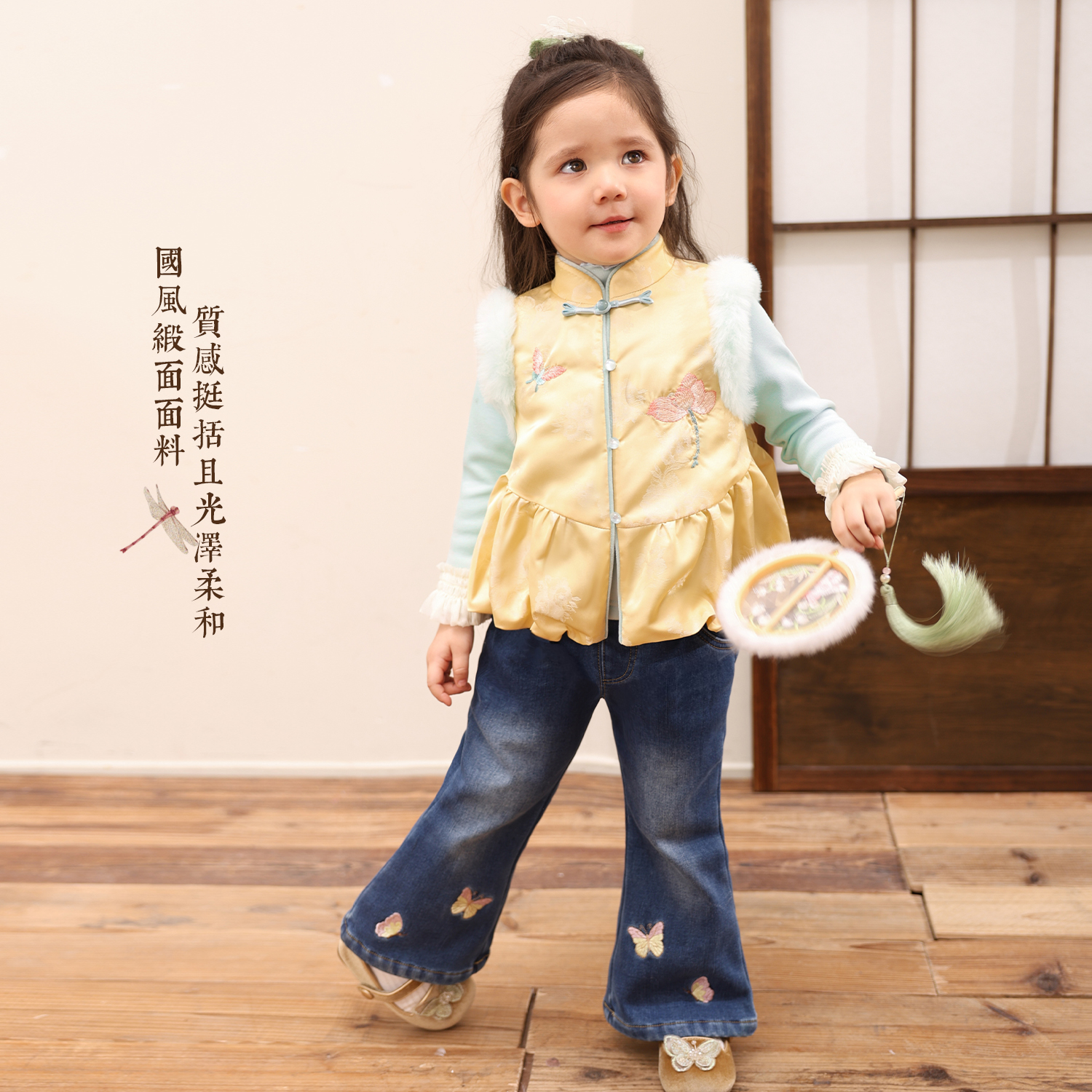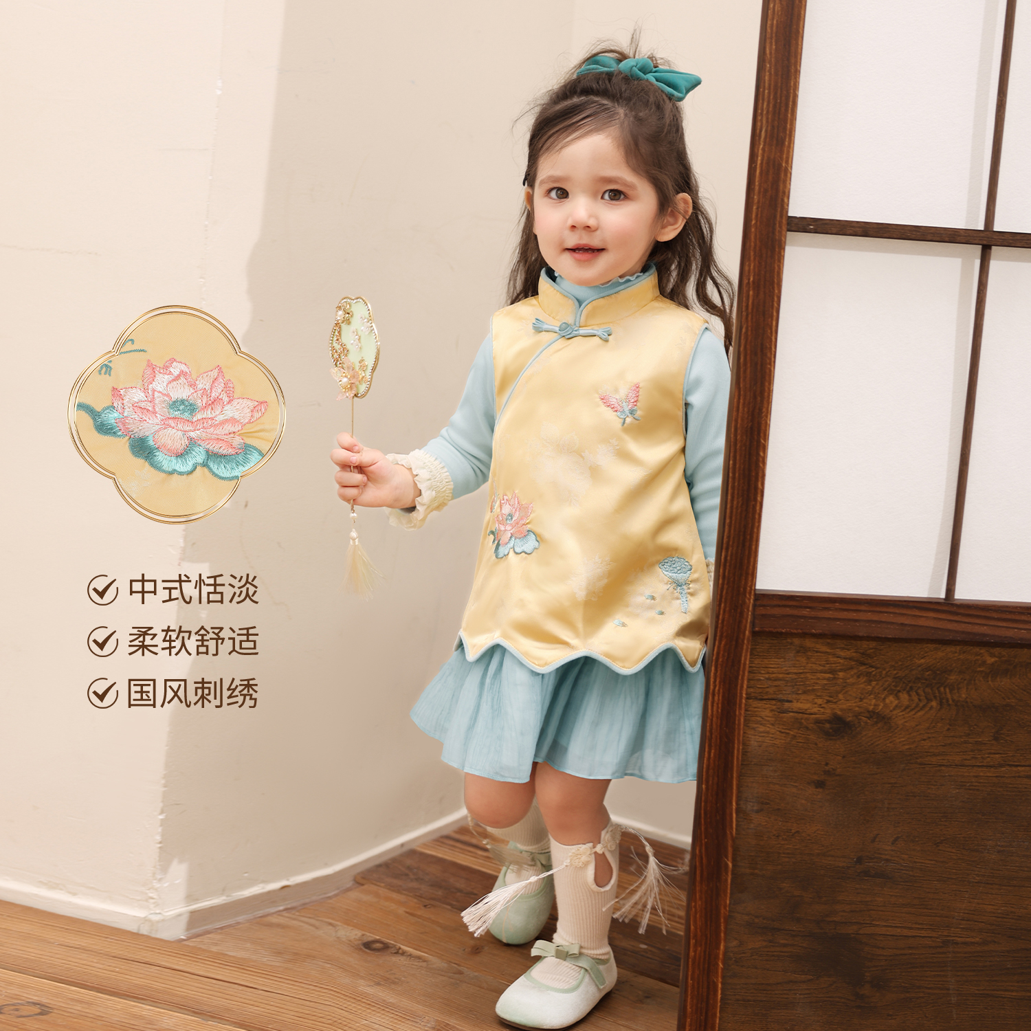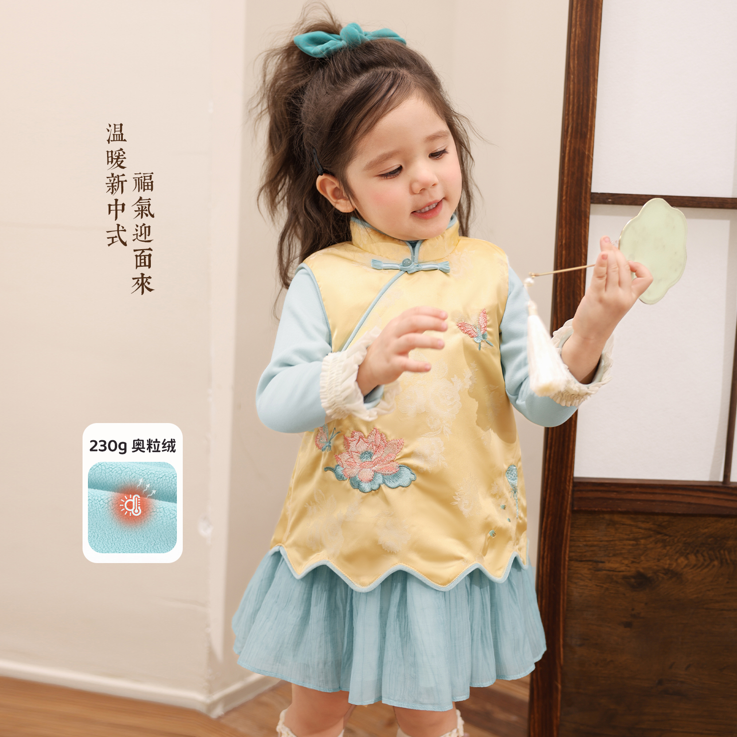 小o爸女婴童 女宝宝新中式拜年服背心裙国风2025新款婴儿加绒套装