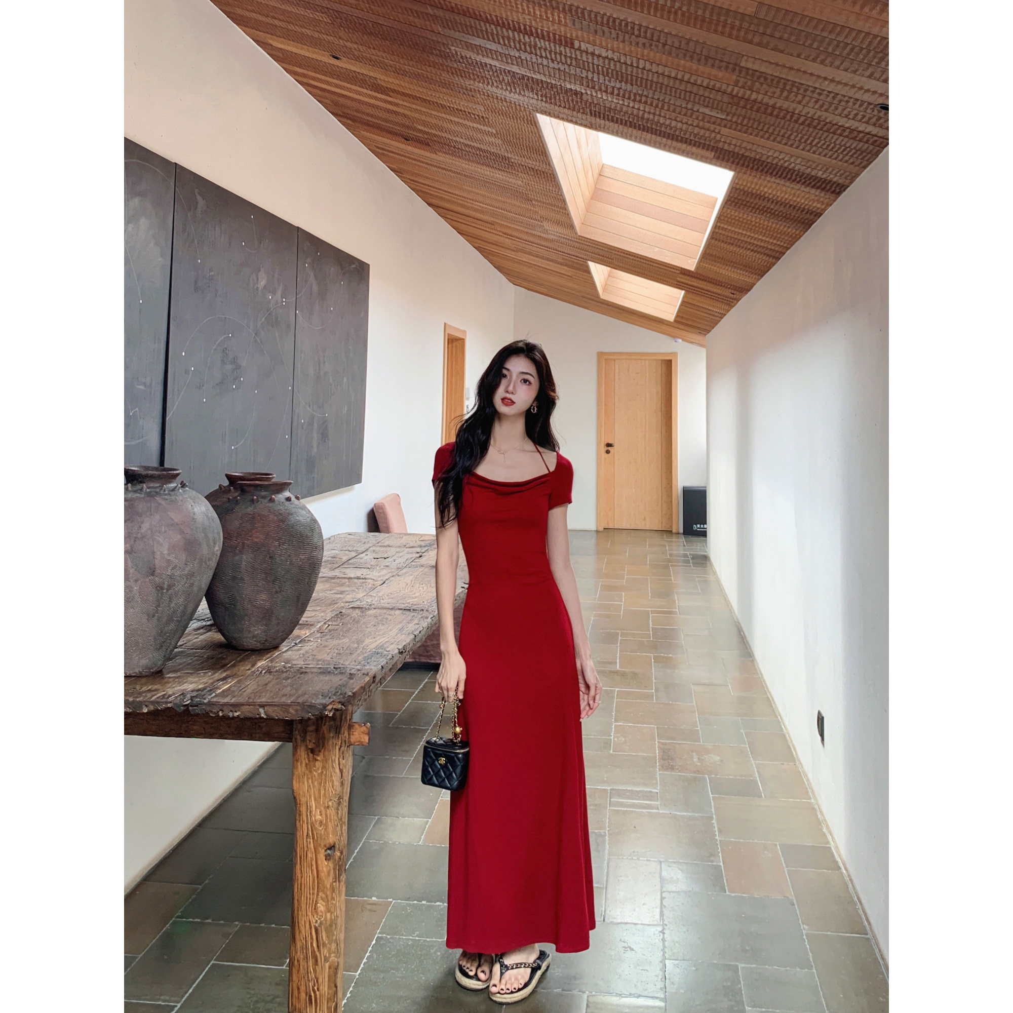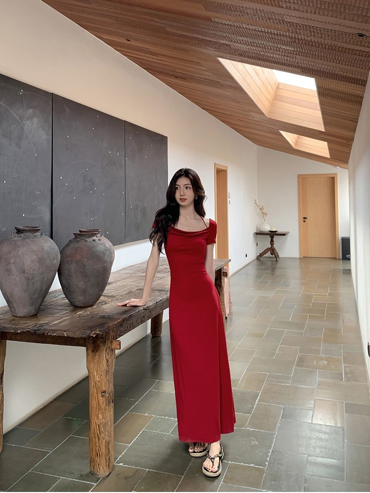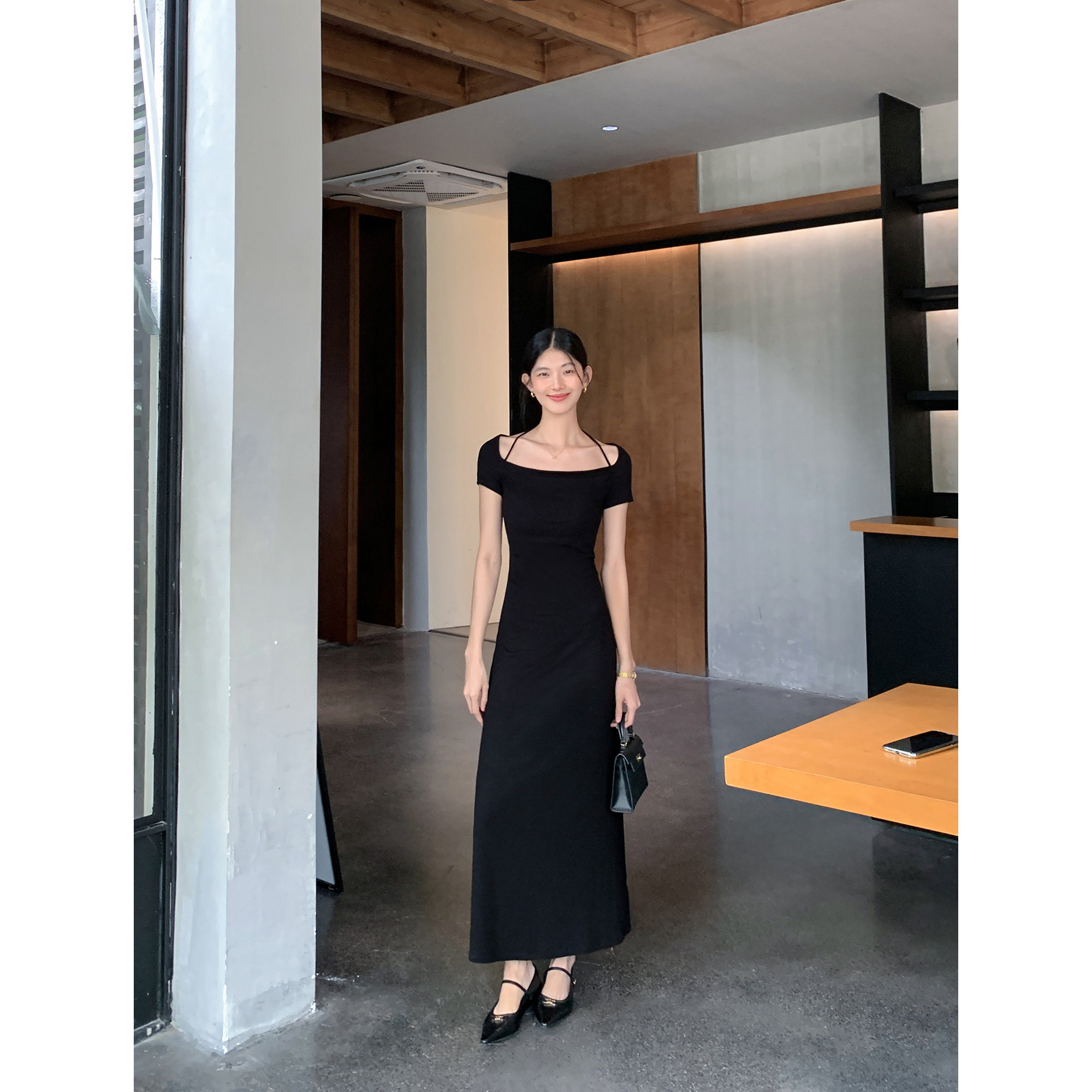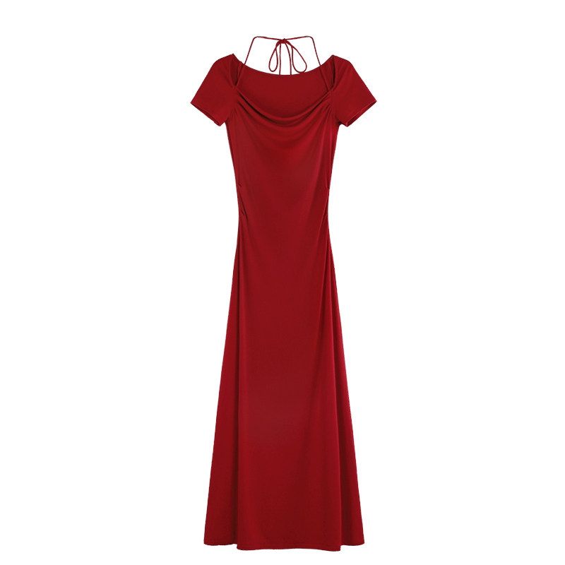 MULVAN 黑色挂脖连衣裙女短袖夏季修身法式复古气质针织长裙