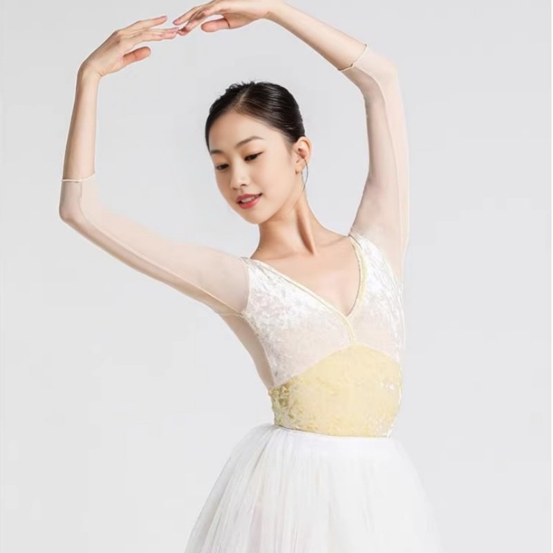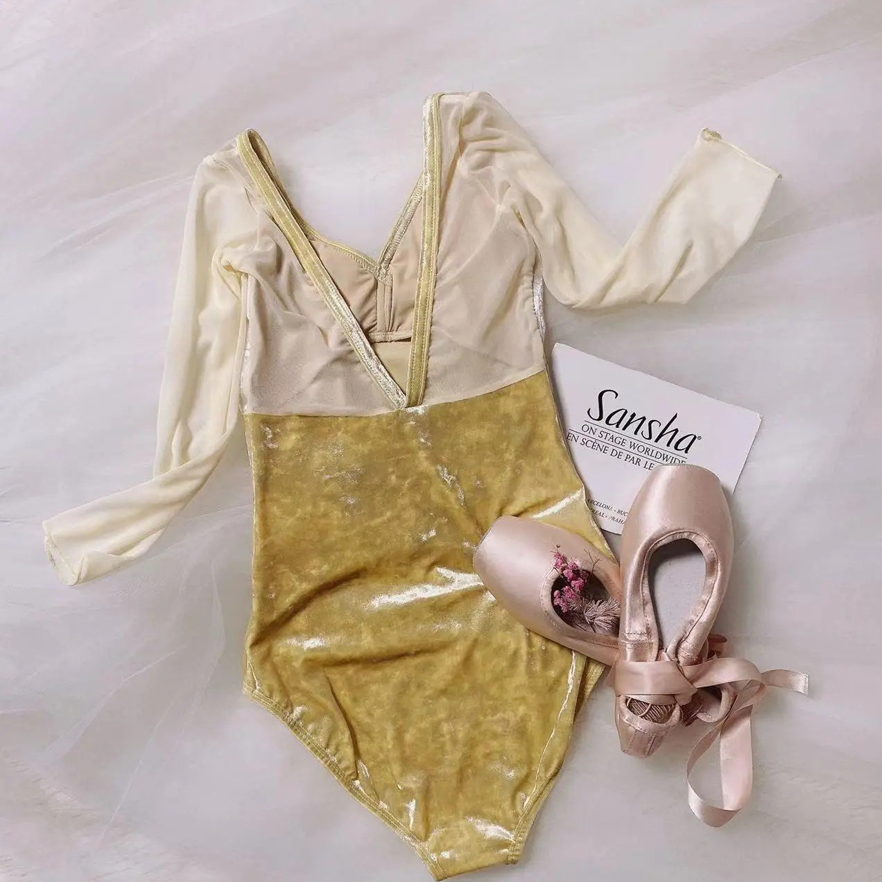 sansha三沙舞蹈连体服 芭蕾舞服七分袖练功服 钻石绒网纱 青绿色