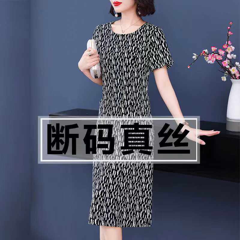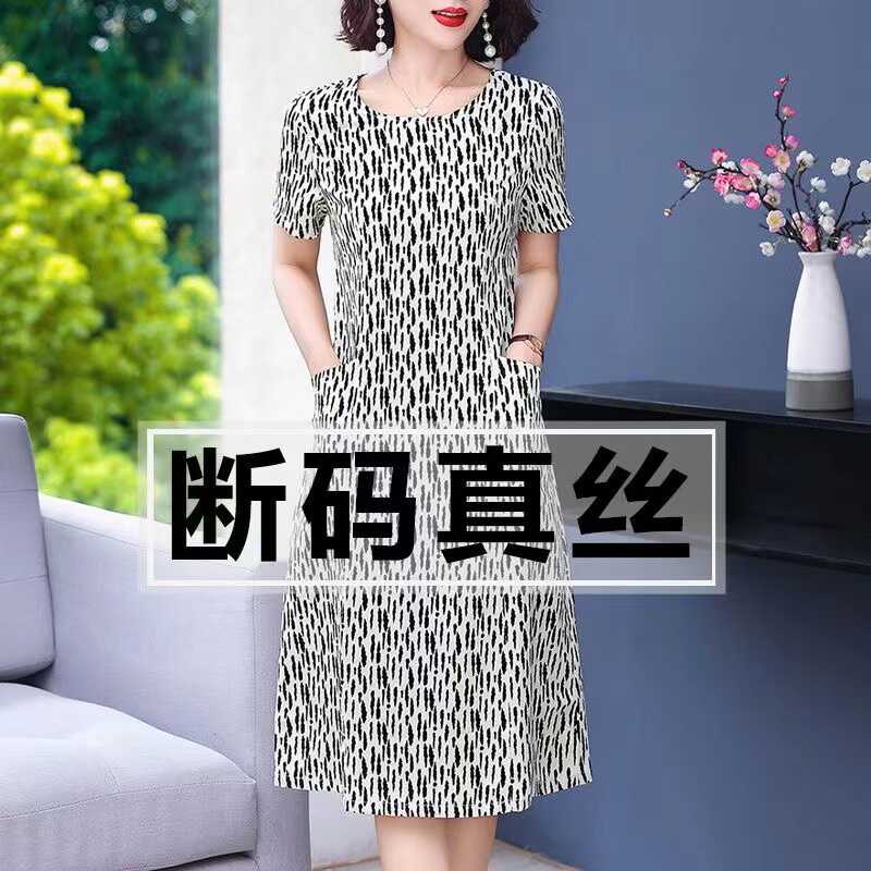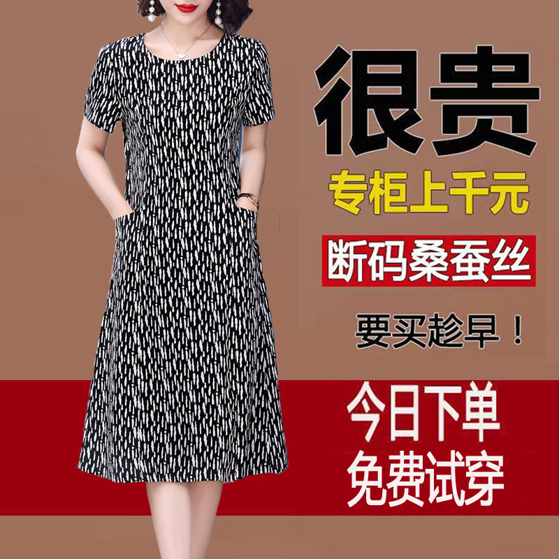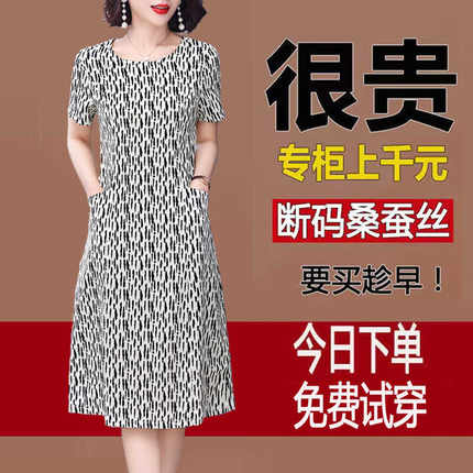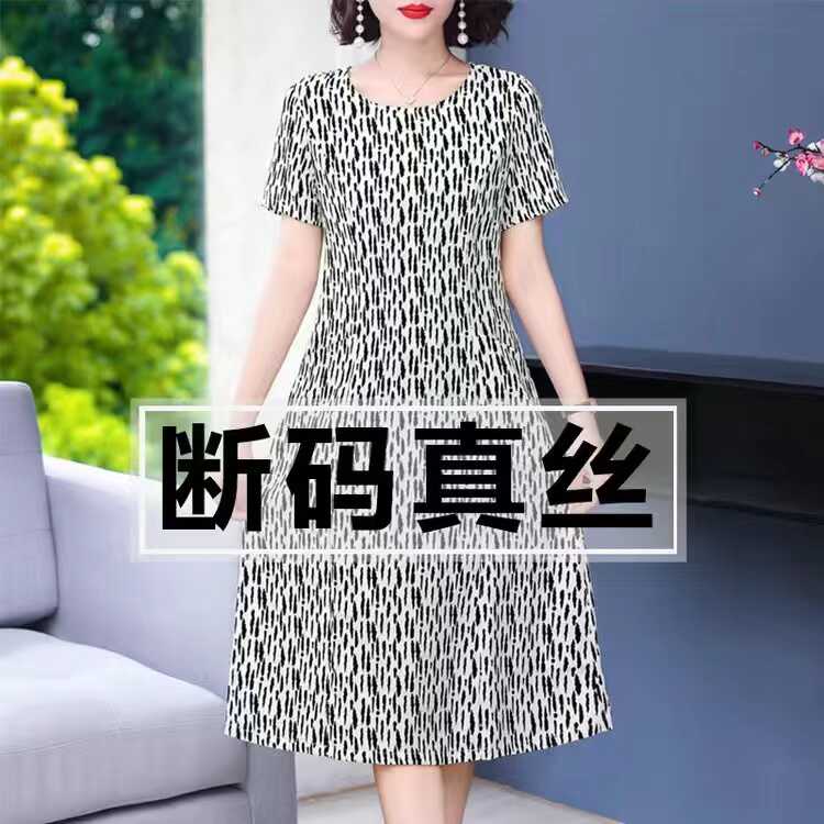 杭州重磅桑蚕丝真丝连衣裙女夏装新款妈妈女装大码遮肚印花中长裙