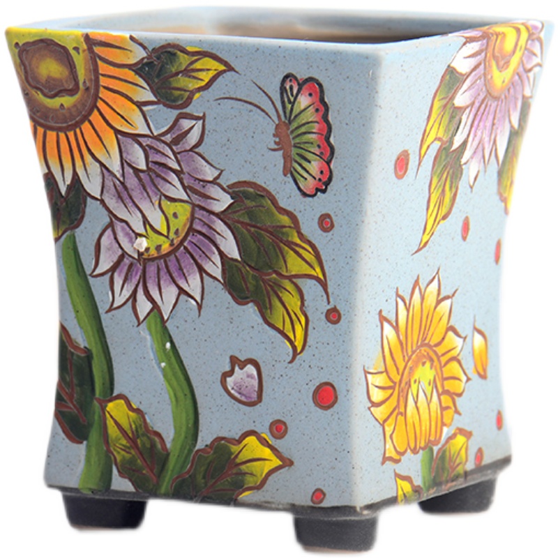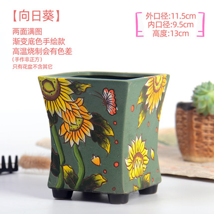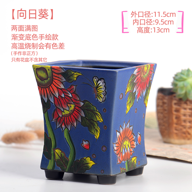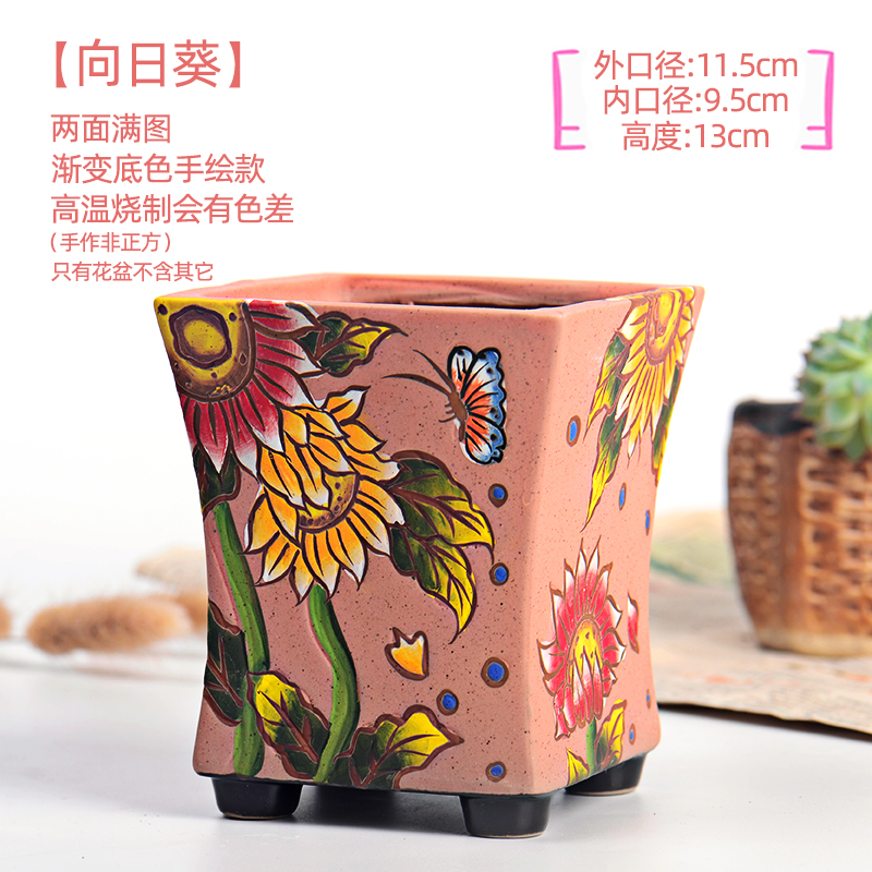 多肉陶瓷老桩方口手绘田园风花盆粗陶透气绿植法师盆方型开口创意