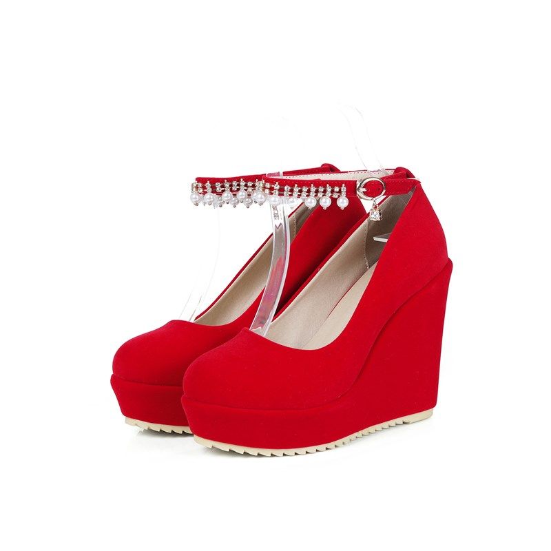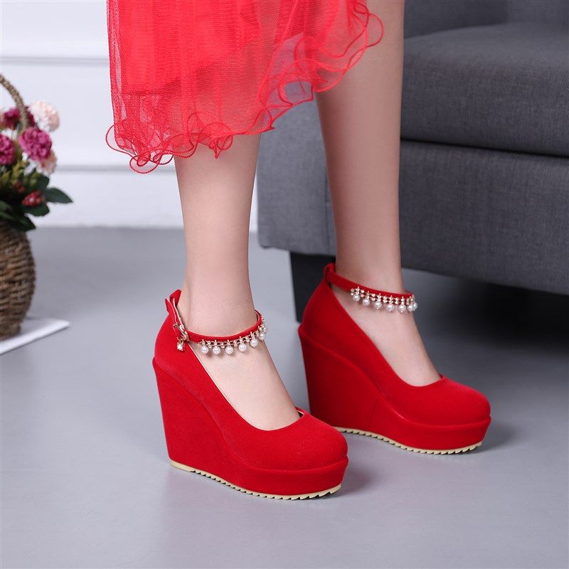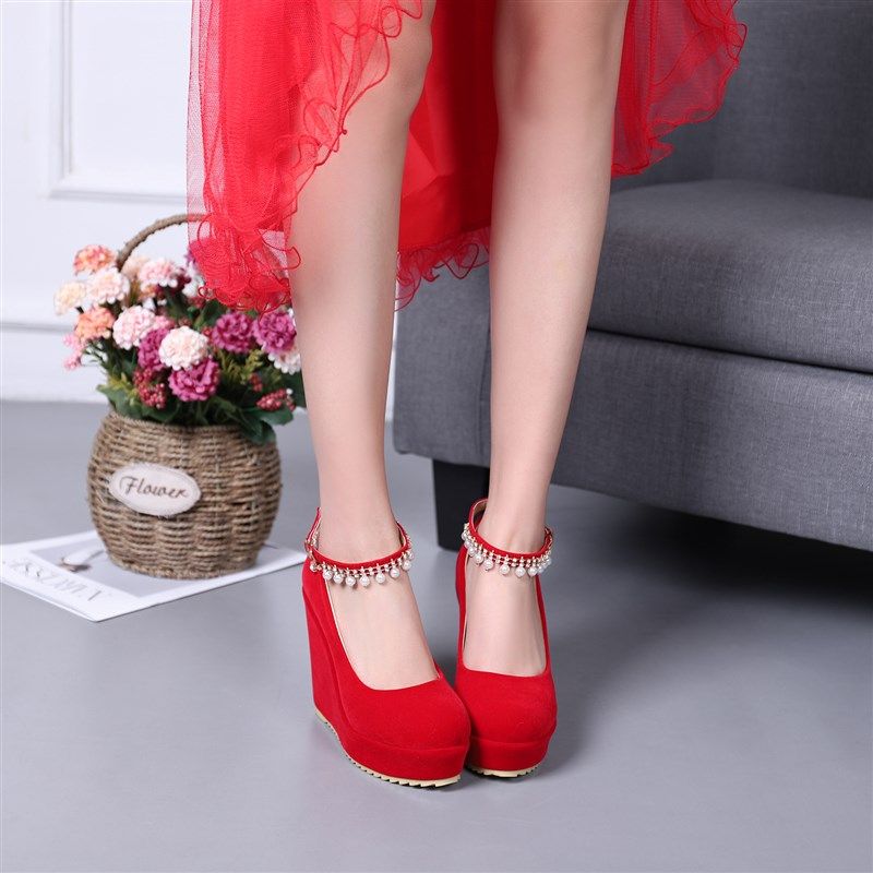 中式婚鞋女大码新款红色高跟鞋结婚鞋子新娘鞋平跟防水台敬酒红鞋