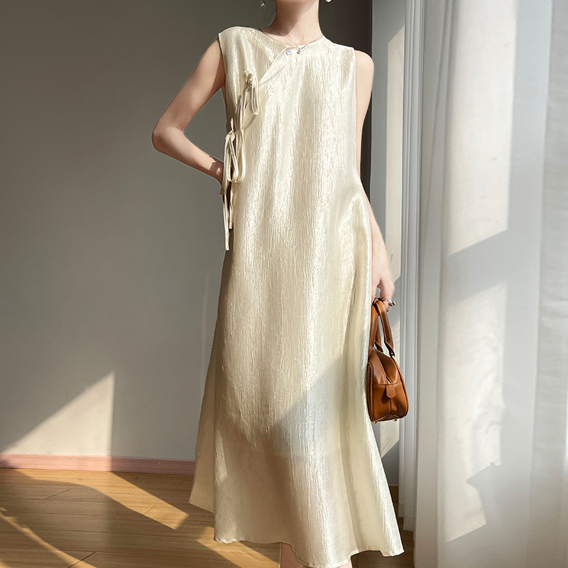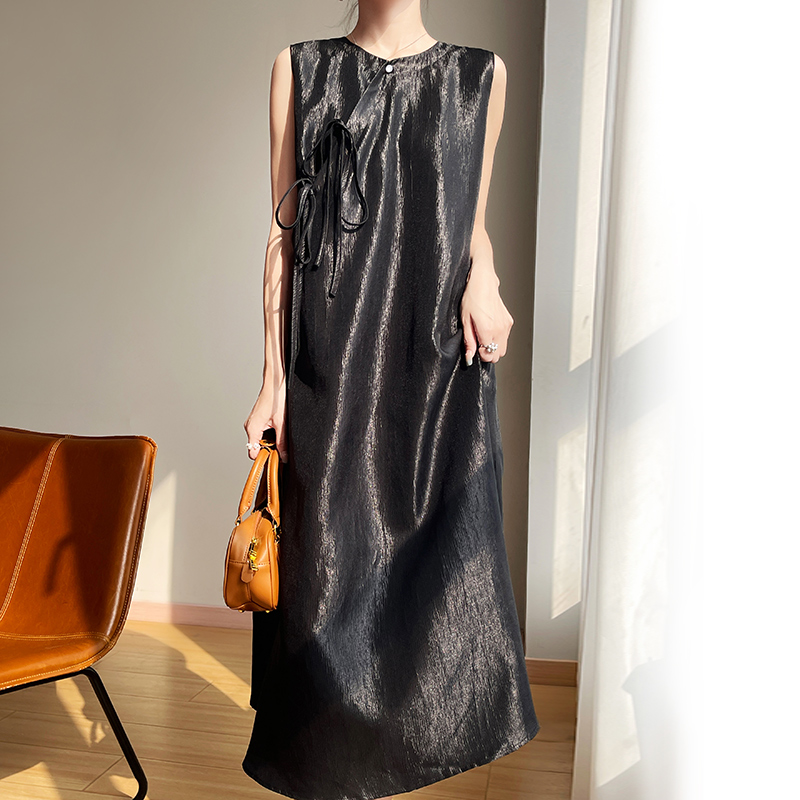 25年夏真丝醋酸缎面圆领连衣裙女设计感纯色中长款裙子无袖背心裙