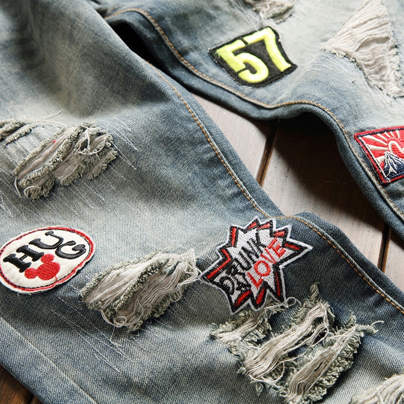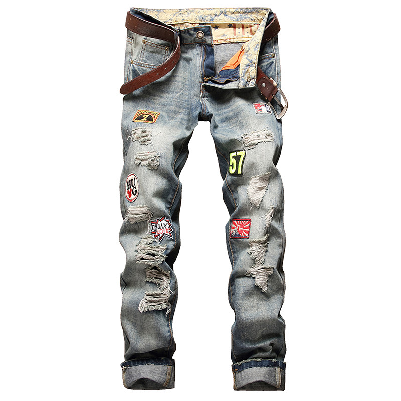 欧美男士直筒破洞补丁牛仔裤潮流青年修身乞丐裤男装徽章个性裤子