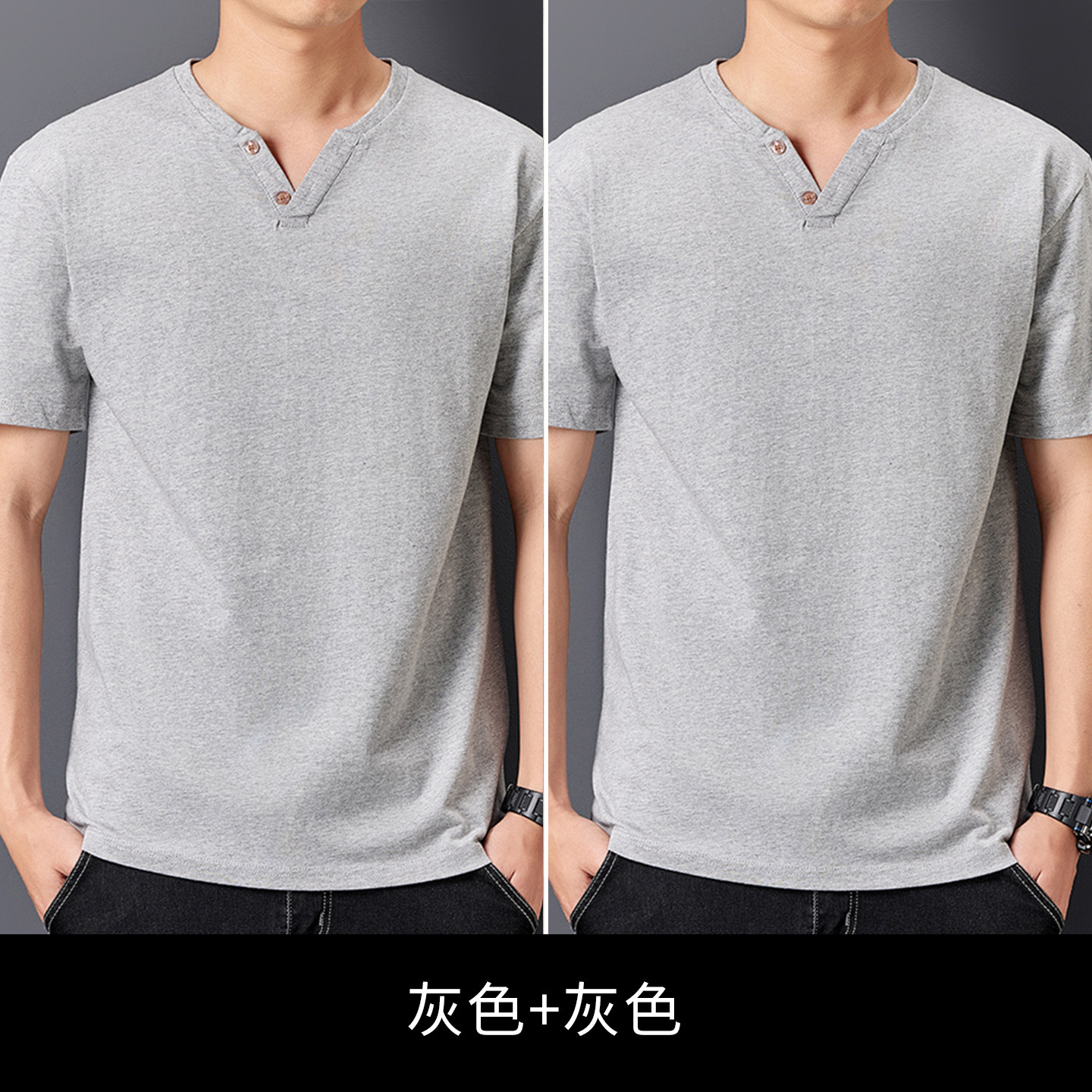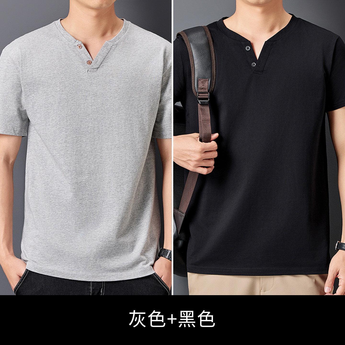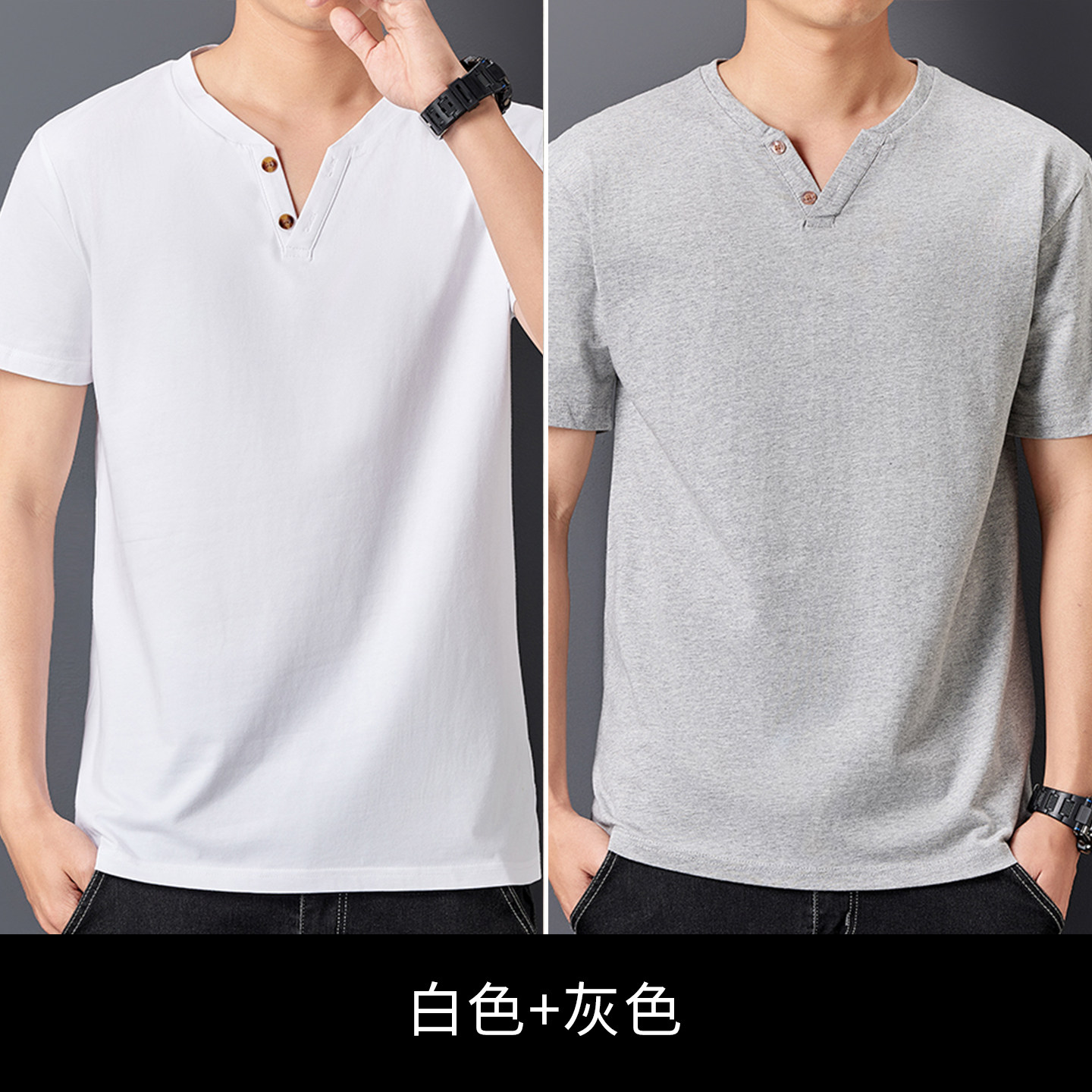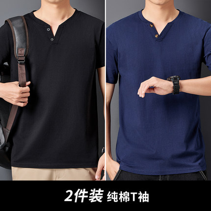 2件】扣子夏季纯棉短袖T恤男装V领宽松大码上衣服打底衫体恤半袖