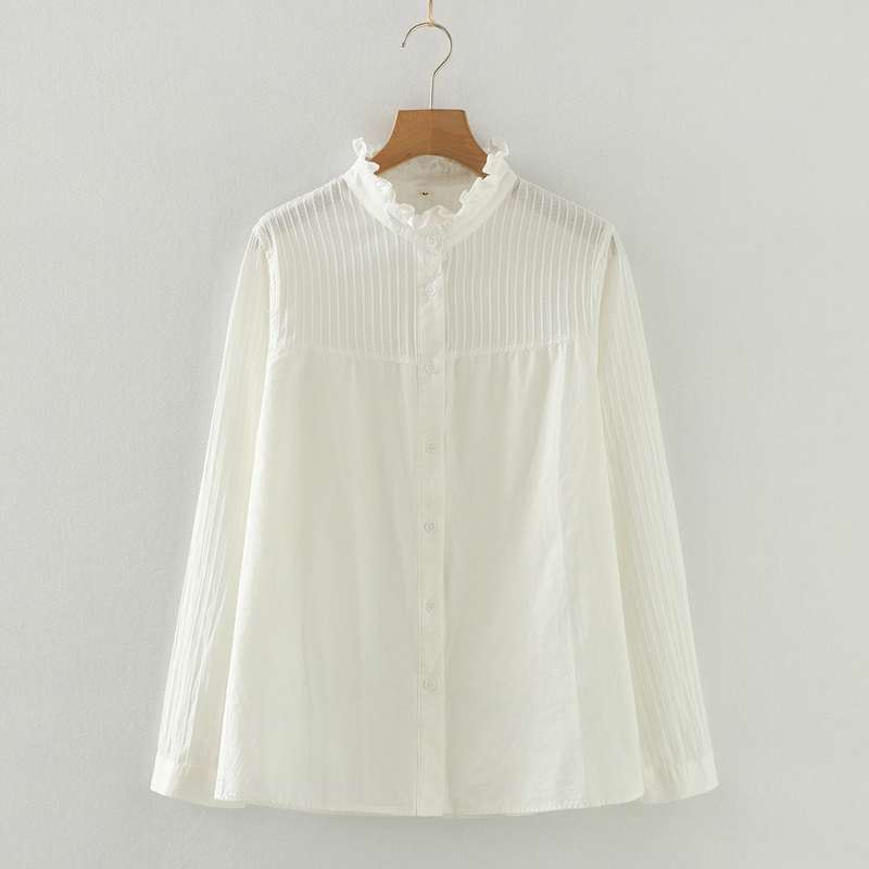 立领木耳边长袖衬衫女宽松百搭文艺竖条拼接白色纯棉女士衬衣内搭