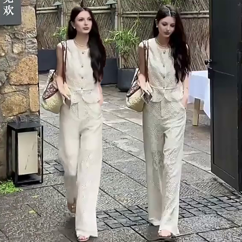 女神范时尚蕾丝套装女2025夏高级感气质无袖上衣直筒阔腿裤两件套
