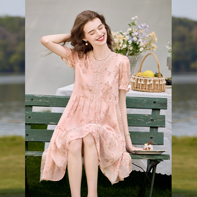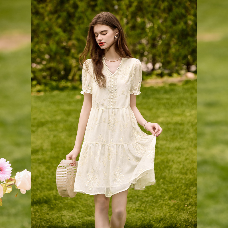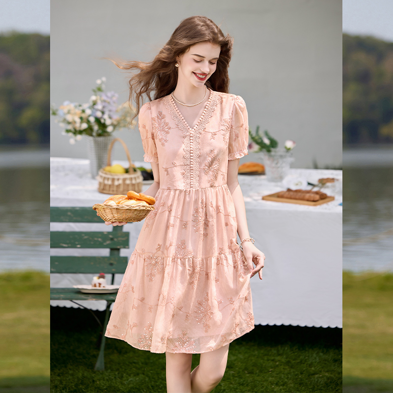 白鹿语重工亮片绣花裙25夏新款时尚花边V领收腰显瘦中长女连衣裙