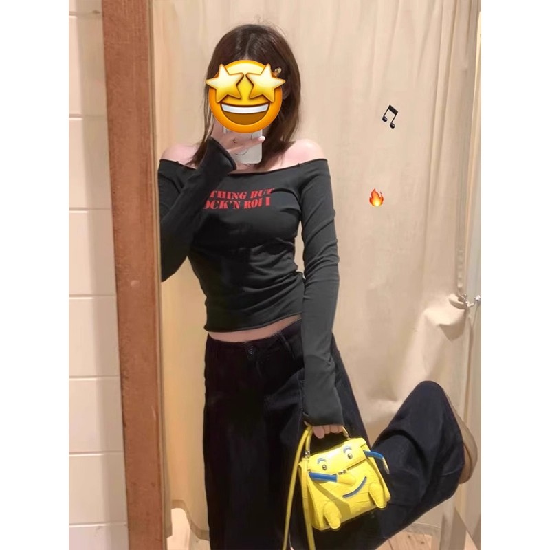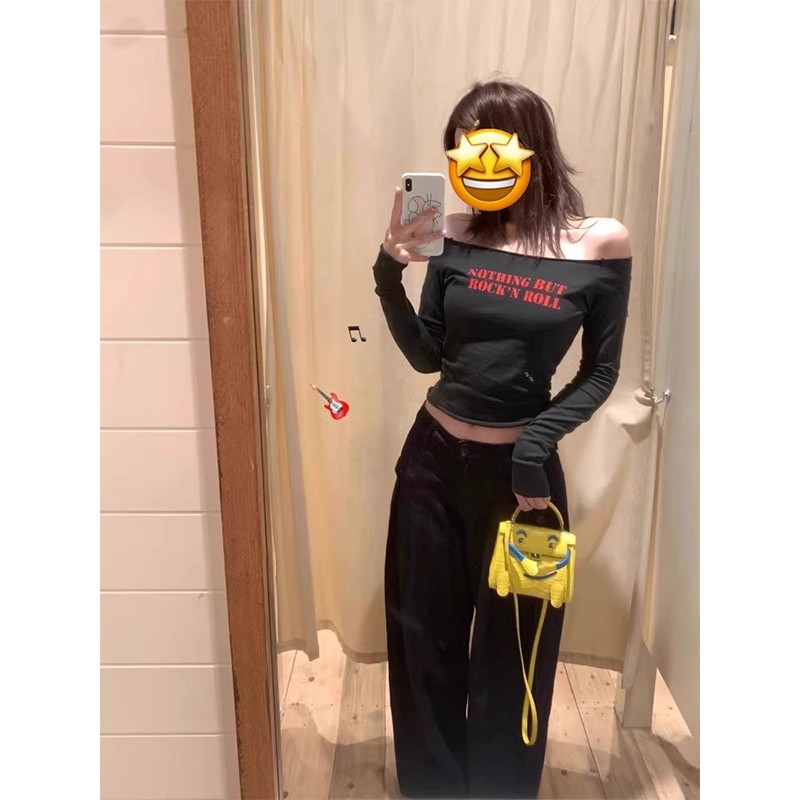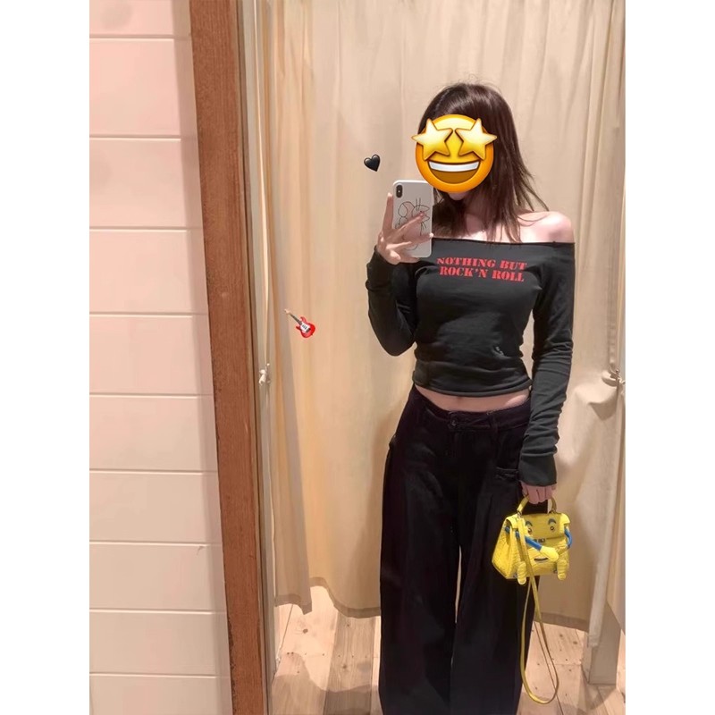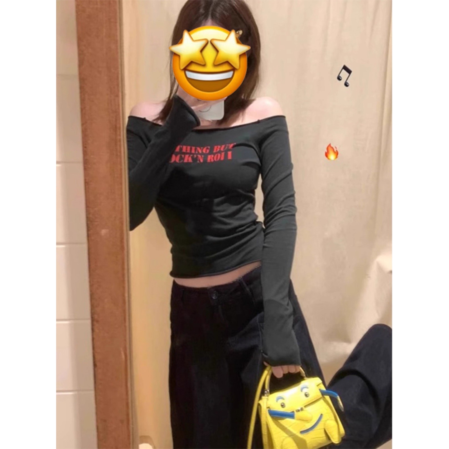 黑色卷边一字领长袖T恤女性感辣妹修身短款锁骨露肩上衣夏季新款