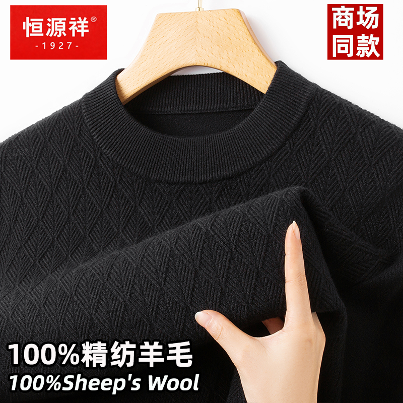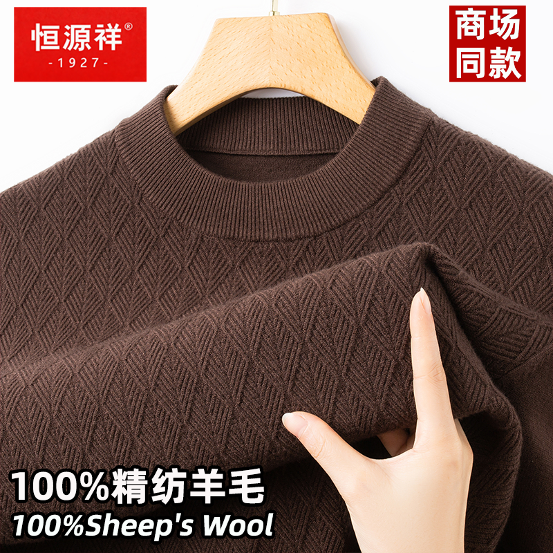 恒源祥100%纯羊毛衫男士圆领提花毛衣秋冬季中年休闲加厚打底上衣