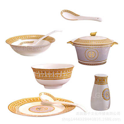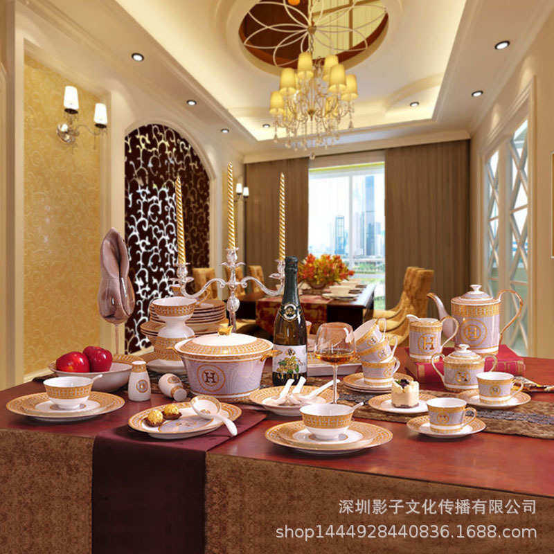 欧式碗碟套装家用58头H标金边结婚送礼瓷器碗盘套碗组合餐具