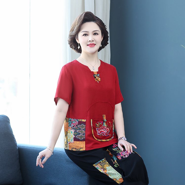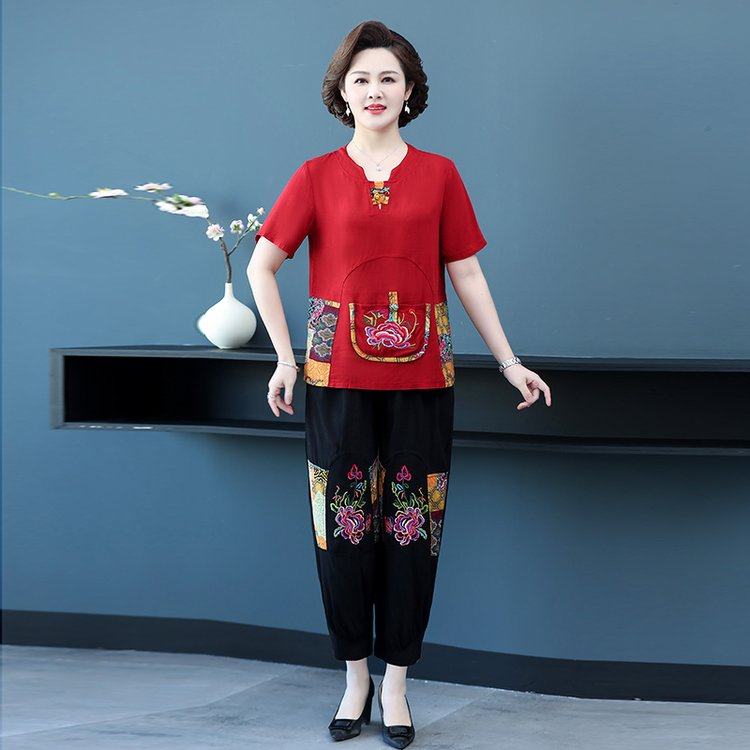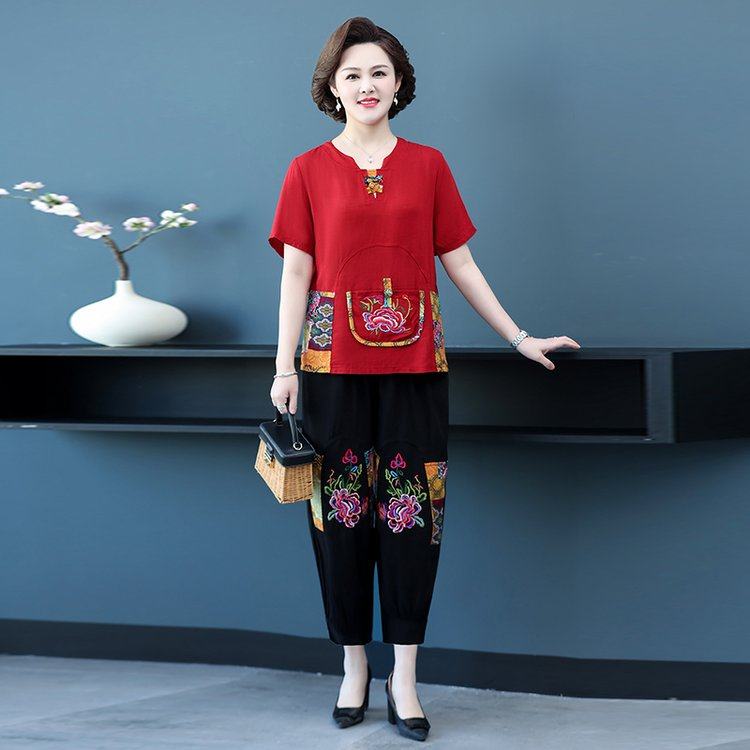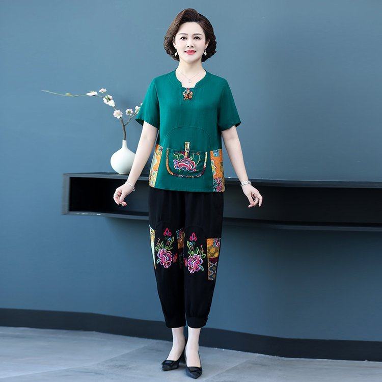 中老年人女装夏装民族风棉麻两件套装妈妈装夏季复古短袖t恤裤子