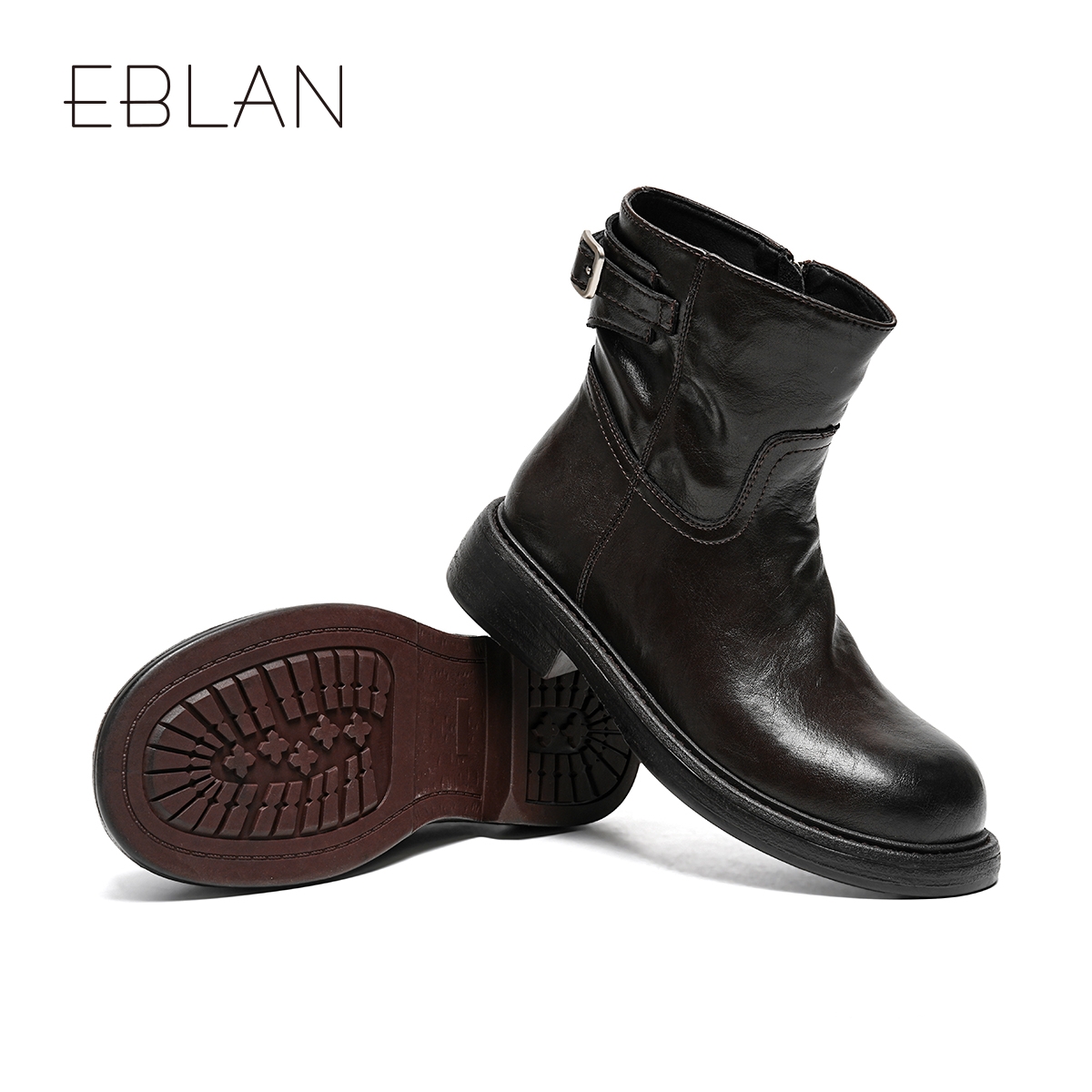 EBLAN/伊伴真皮厚底马丁靴女2025秋冬新款加绒机车靴褶皱短筒靴子