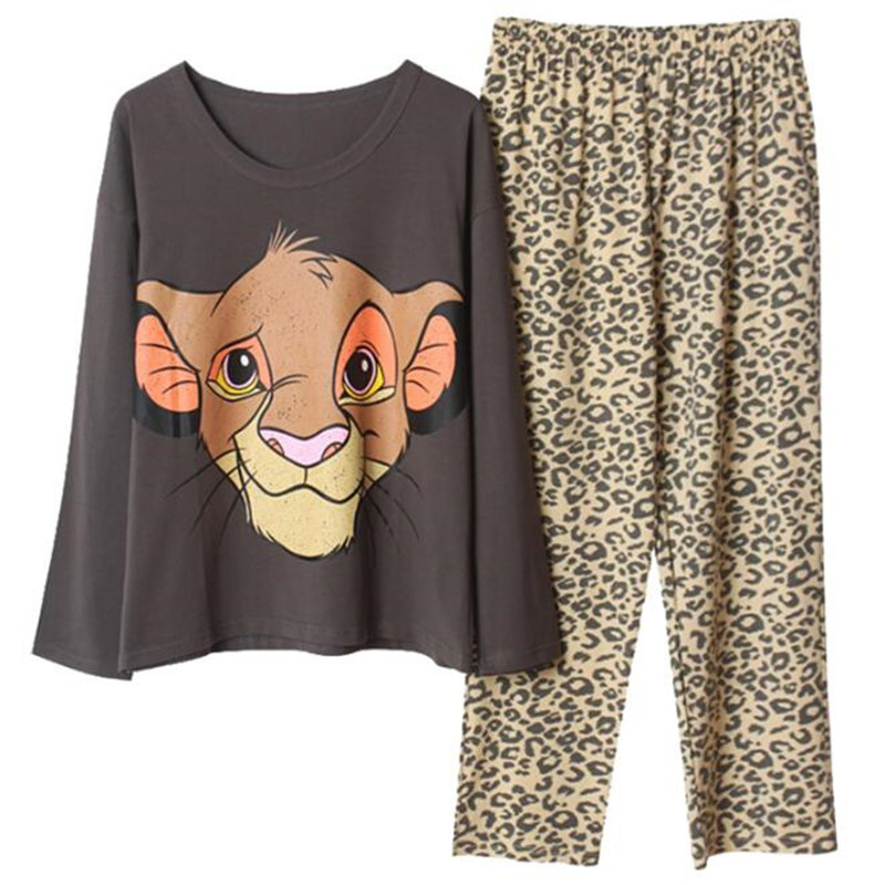 日系ins睡衣女秋纯棉可爱卡通小狮子家居服大码胖mm200斤豹纹套装