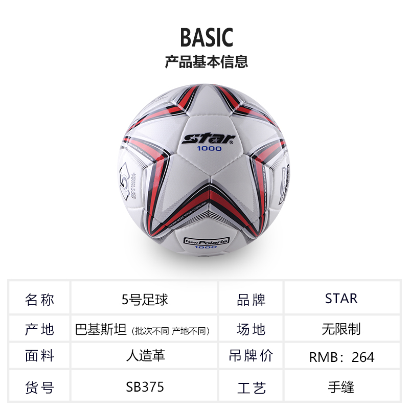 皇贝足球正品STAR世达1000真皮感比赛训练防滑标准手缝5号球SB375