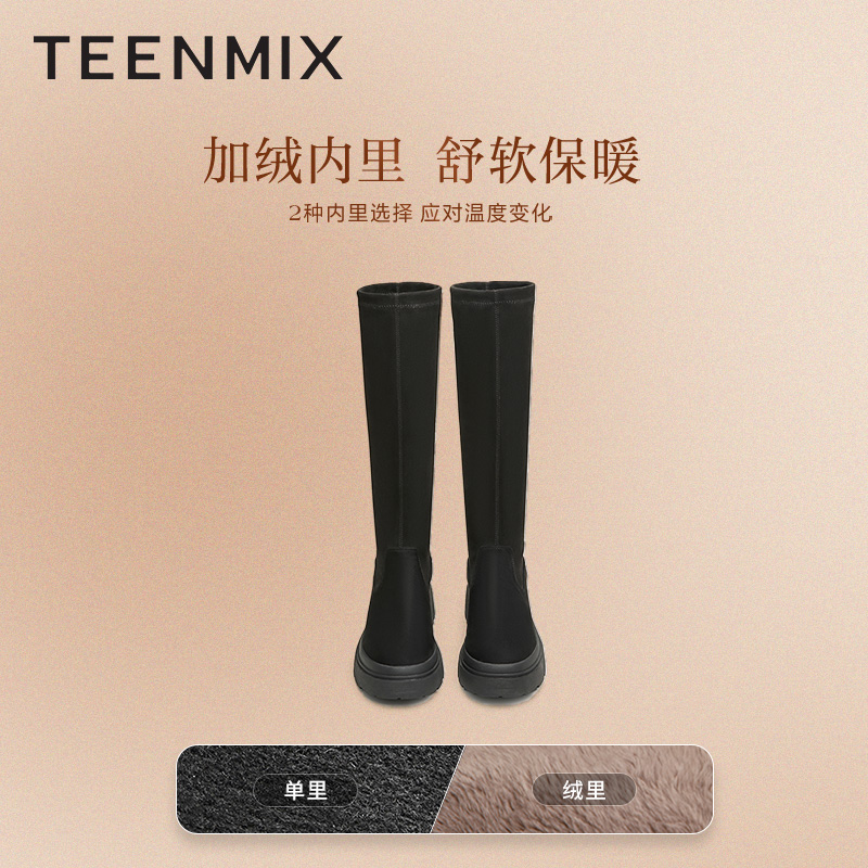 天美意厚底加绒弹力时装靴长靴女高筒骑士靴奥莱