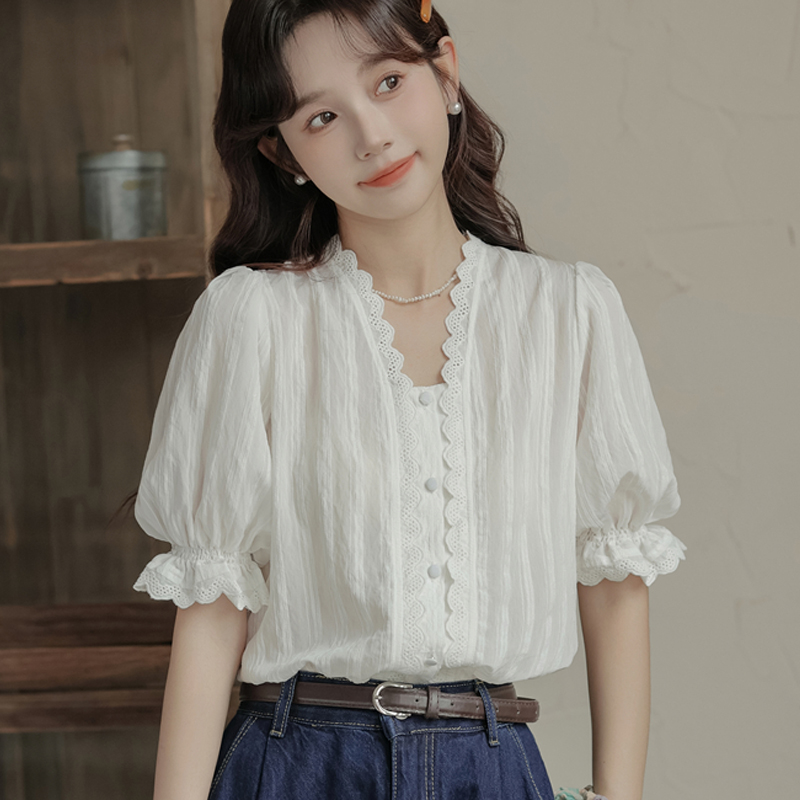 v领上衣女短袖2025新款夏款显瘦冷淡系高级感泡泡袖白色衬衫