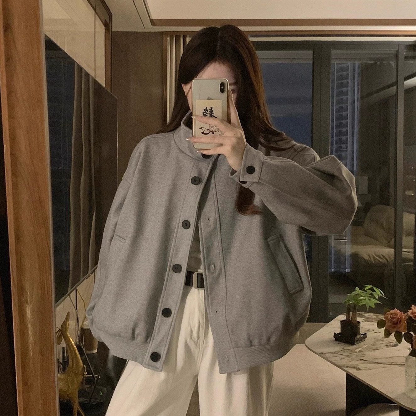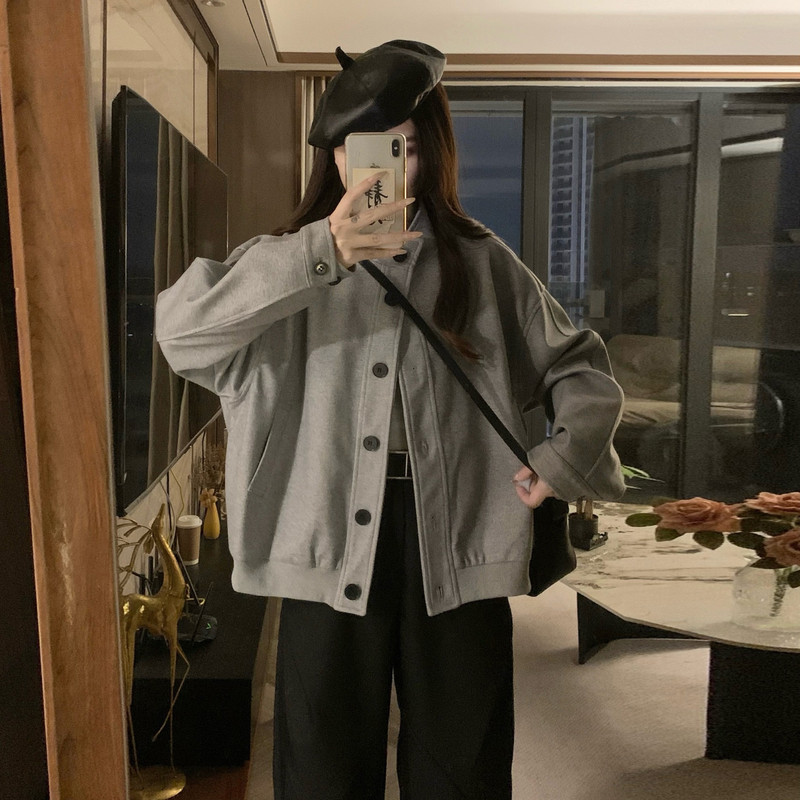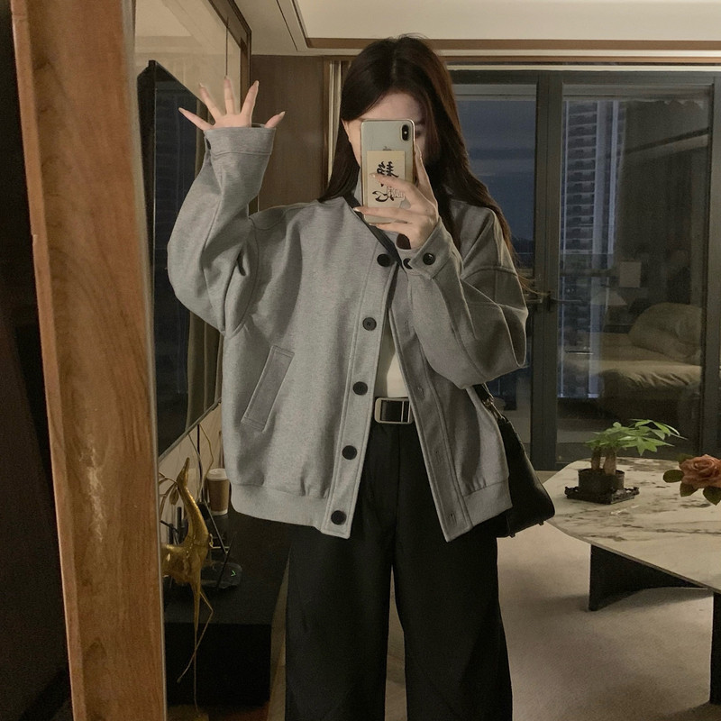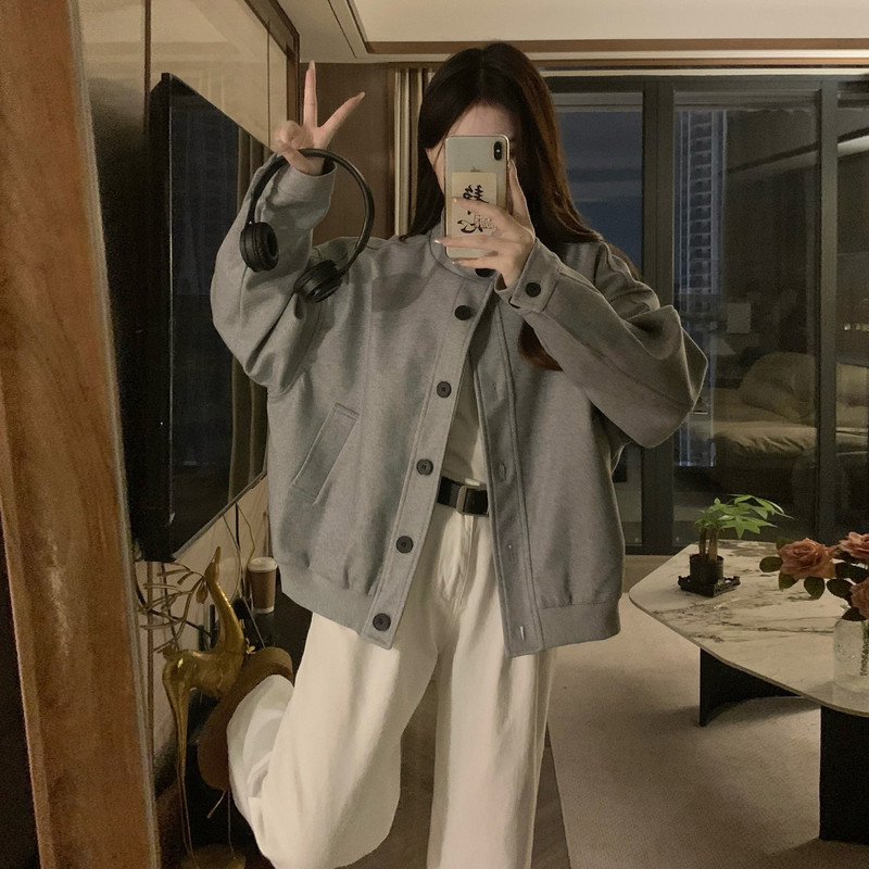 甜酷立领灰色夹克外套女春秋款复古小众设计感上衣棒球服小个子潮