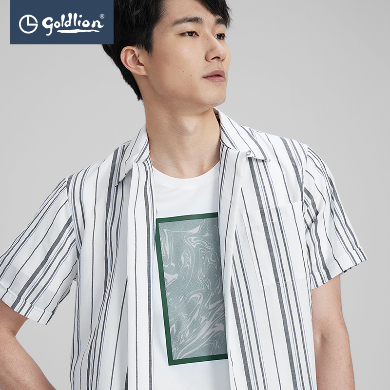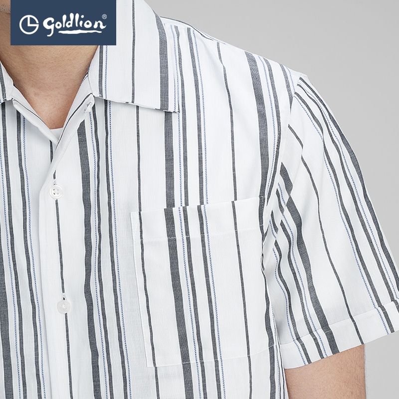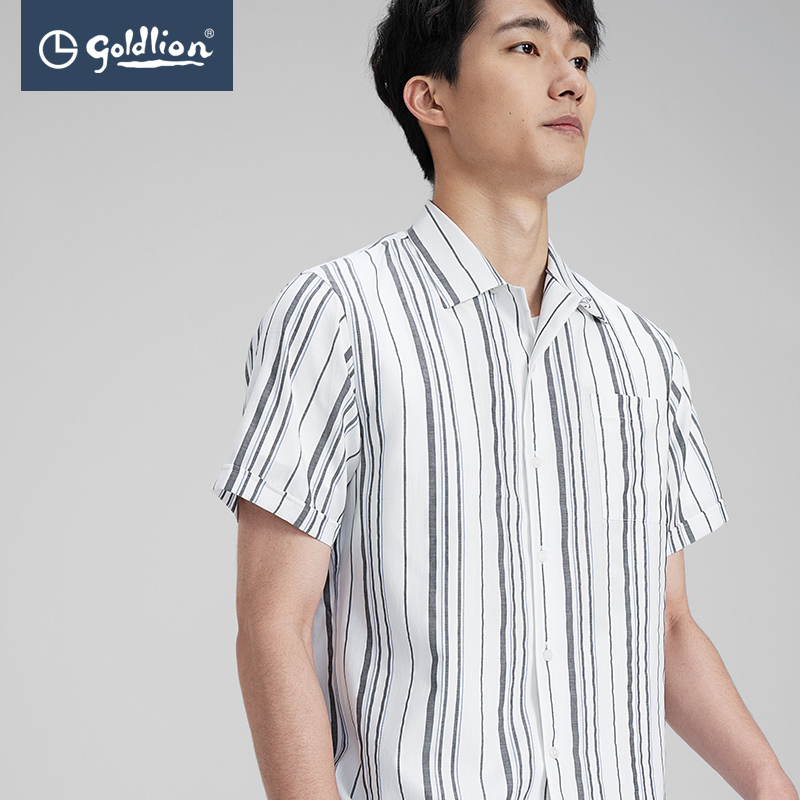 金利来奥特莱斯款男士棉麻透气古巴领条纹口袋休闲短袖衬衫