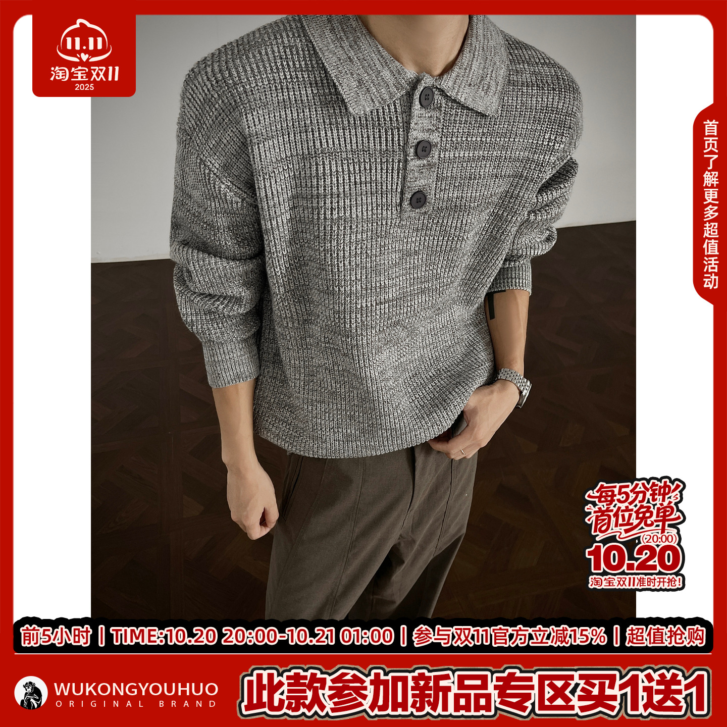悟空有货复古老钱风POLO领毛衣男潮牌秋季情侣休闲百搭套头针织衫
