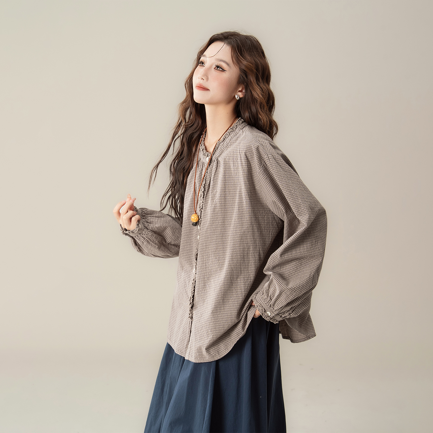 复古格子花边领长袖衬衫女秋季新款慵懒松弛感通勤穿搭显瘦上衣潮
