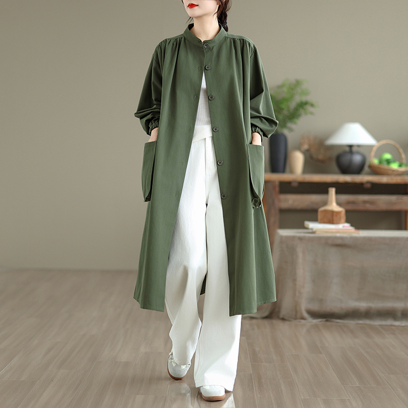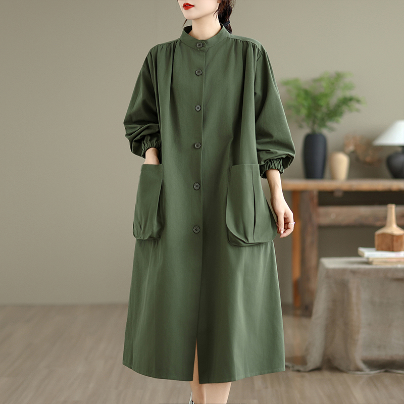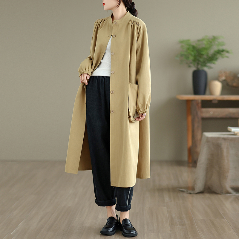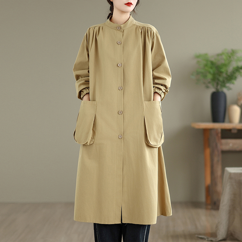 宽松文艺长袖风衣秋冬立领纯色大口袋中长款休闲外套大口袋纯色