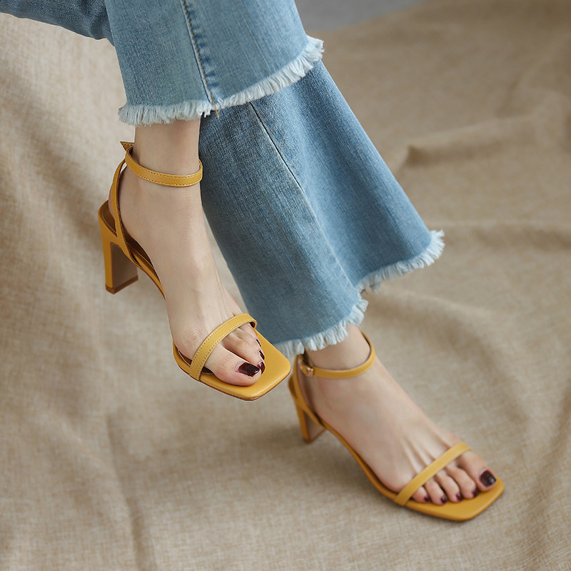 简约方头一字带凉鞋女粗跟露趾高跟鞋夏季仙女风中跟气质名媛女鞋