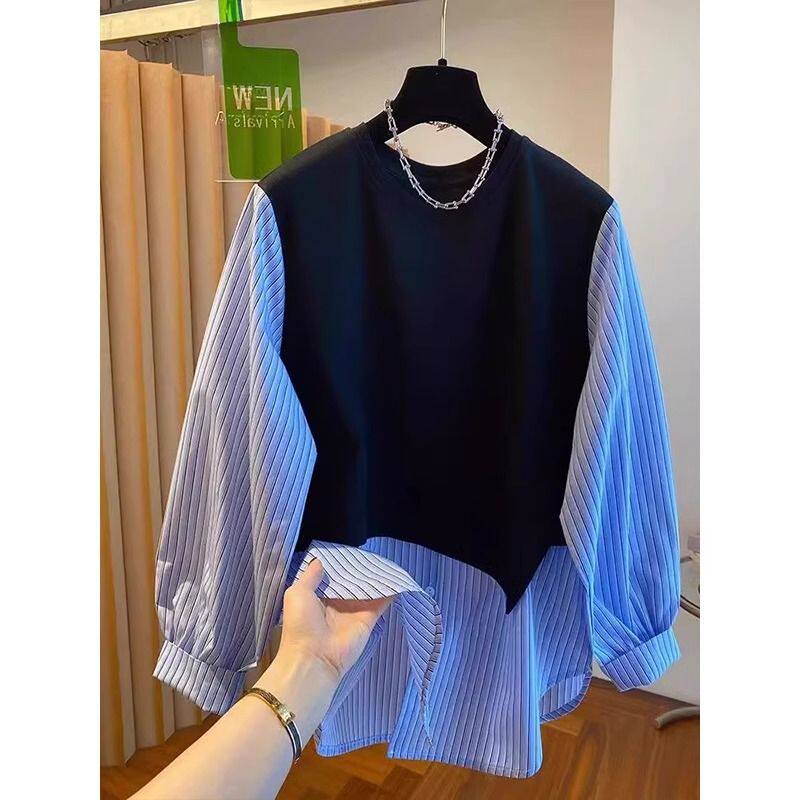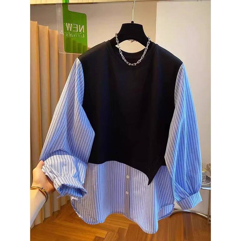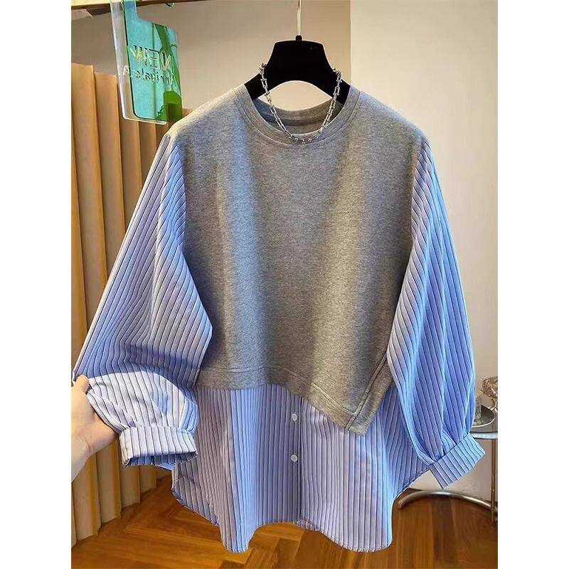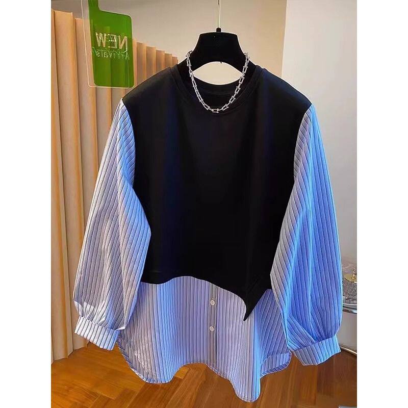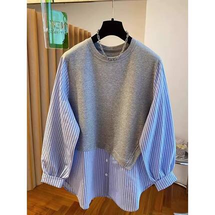 2026新款大码韩系条纹设计感圆领卫衣女初春新款假两件拼接衬衫