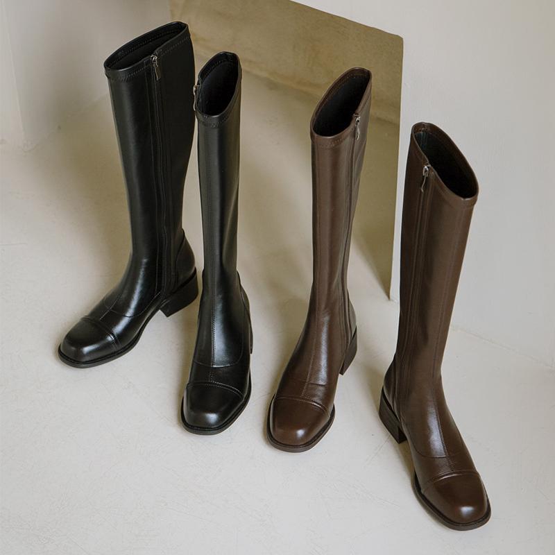 不过膝高筒靴女秋冬加绒粗跟复古弹力骑士靴子小个子显瘦棕色长靴