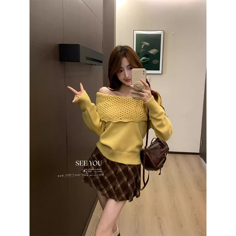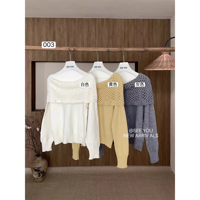 温柔风洋气气质长袖一字领露肩别致钩花镂空套头软糯针织衫毛衣女