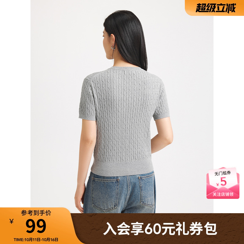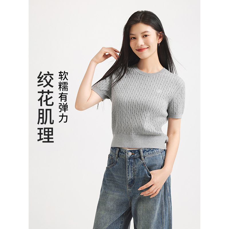 热风miu系针织衫短袖上衣2025年秋季新款女士绞花灰色圆领短袖